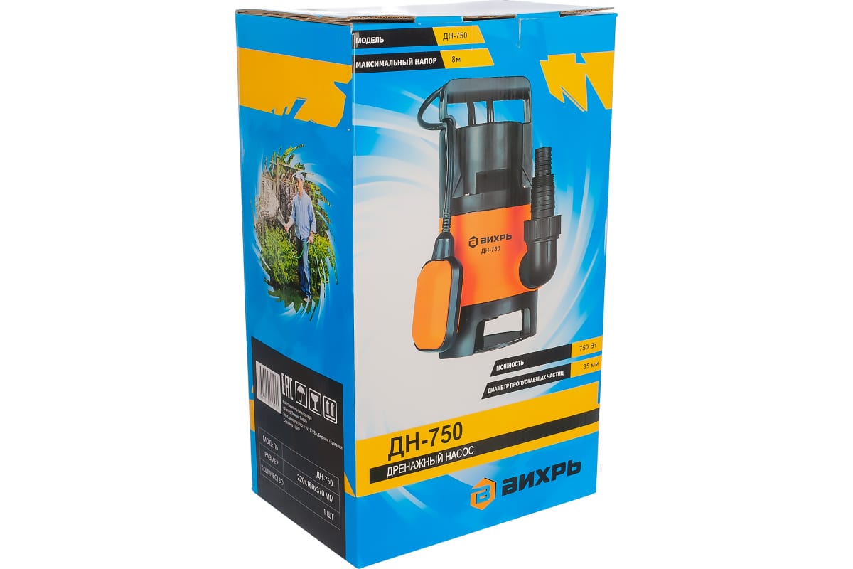 Дренажный насос Вихрь ДН-750 используется для откачивания вод из подтопленных помещений или в качестве силового агрегата в системах орошения. Насос оснащен производительным двигателем 750 Вт, в котором предусмотрен датчик для защиты от перегрева. Устройство автоматически включается и выключается при критическом уровне воды, благодаря поплавковому механизму. Может перекачивать воду с допустимым размером твердых примесей 25мм. Высота водяного столба составляет 8 м.