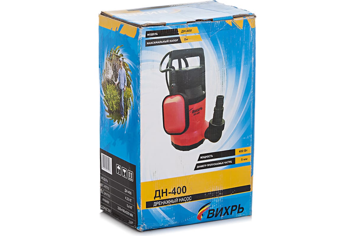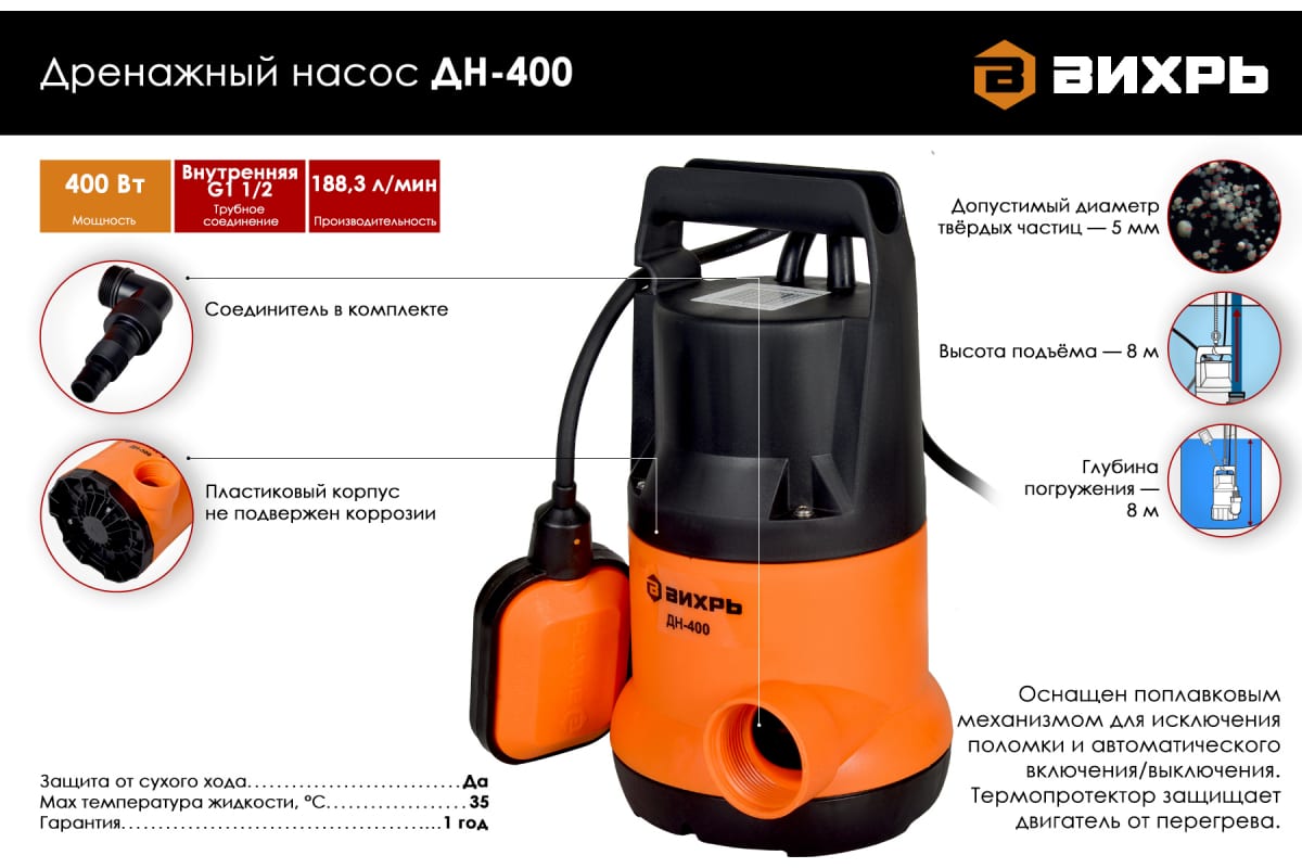 Дренажный насос Вихрь ДН-400 отличается высокой производительностью. Имеет ударопрочный корпус. Оснащен поплавковым механизмом для исключения поломки и автоматического включения/выключения. Перекачивает чистую и слабозагрязненную воду с частицами размером до 5 мм.