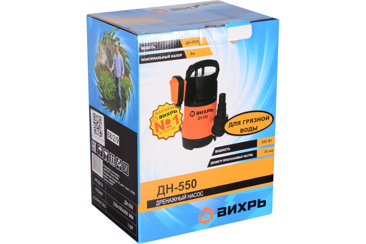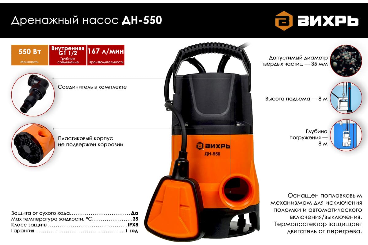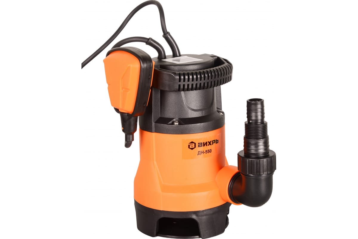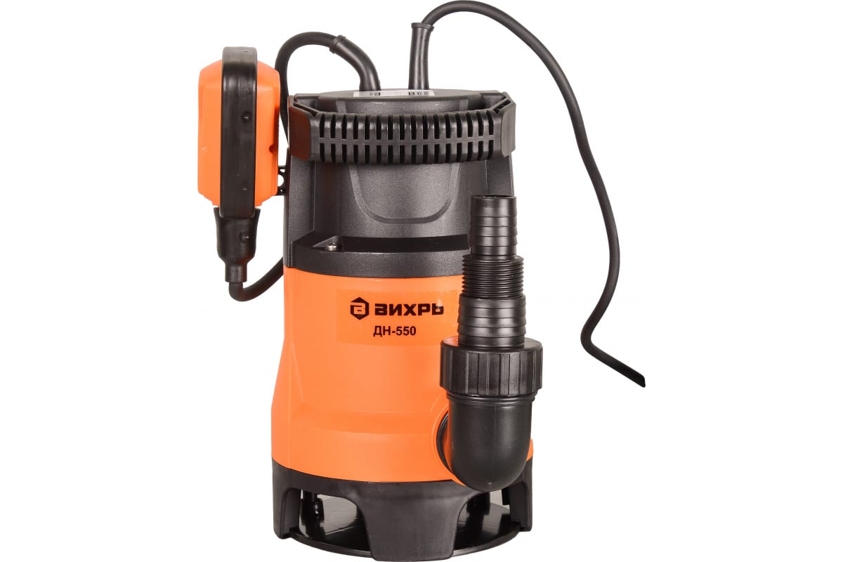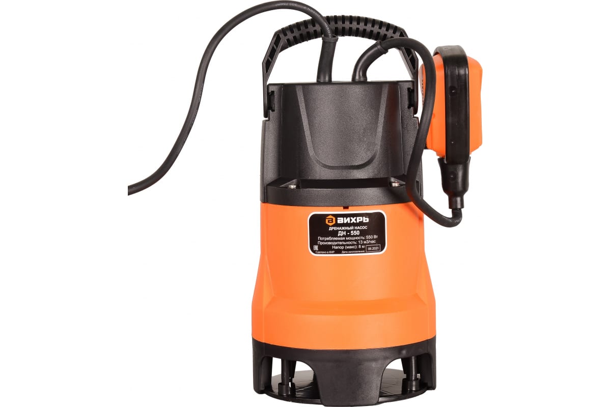 Дренажный насос Вихрь ДН-550, может пригодиться для устранения подтоплений, выкачивания воды из подвалов или погребов. Способен перекачивать до 167 литров жидкости в минуту. Устройство автоматически включается и выключается при критическом уровне воды, благодаря поплавковому механизму.