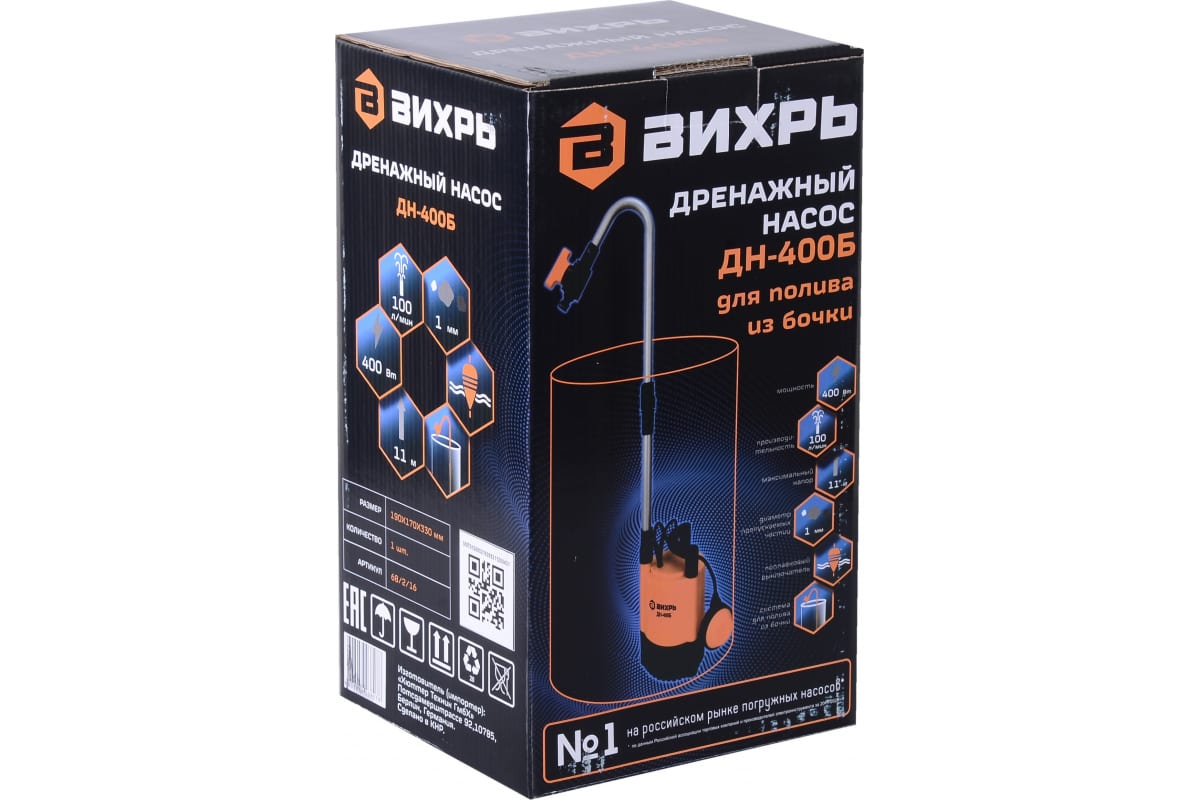 Насос дренажный "ВИХРЬ" для чистой воды 100 л/мин 400 Вт ДН-400Б 68/2/16
