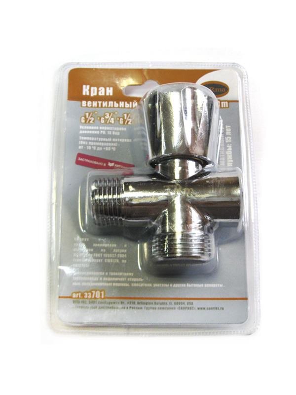 Кран вентильный применяется в качестве запорно-регулировочной арматуры при подключении санитарно - технических приборов (смывного бачка, стиральной или посудомоечной машины) к внутриквартирному трубопроводу. Использование вентильного крана позволяет регулировать расход воды при одновременном последовательном включении нескольких сантехнических (бытовых) приборов. Кран может применяться в качестве запорной арматуры, а также устанавливаться на трубопроводах, транспортирующих жидкости, не агрессивные к материалу его элементов, при давлении жидкости до 8 бар и температуре среды до +80°С. Резьба внутренняя 1/2"/наружная 3/4"/наружная 1/2".