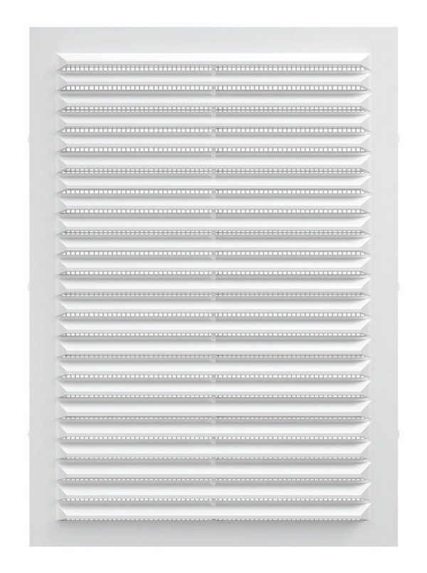 Вентиляционная решетка имеет наклонные жалюзи и оснащена защитной сеткой от насекомых.