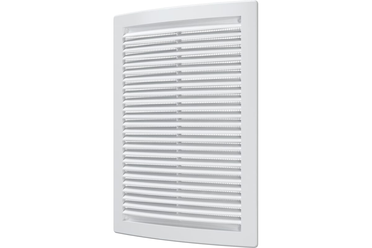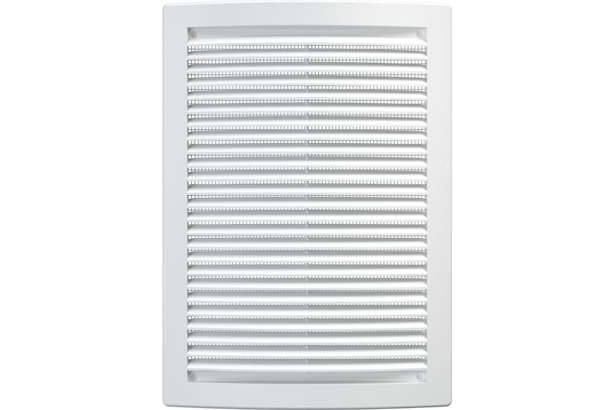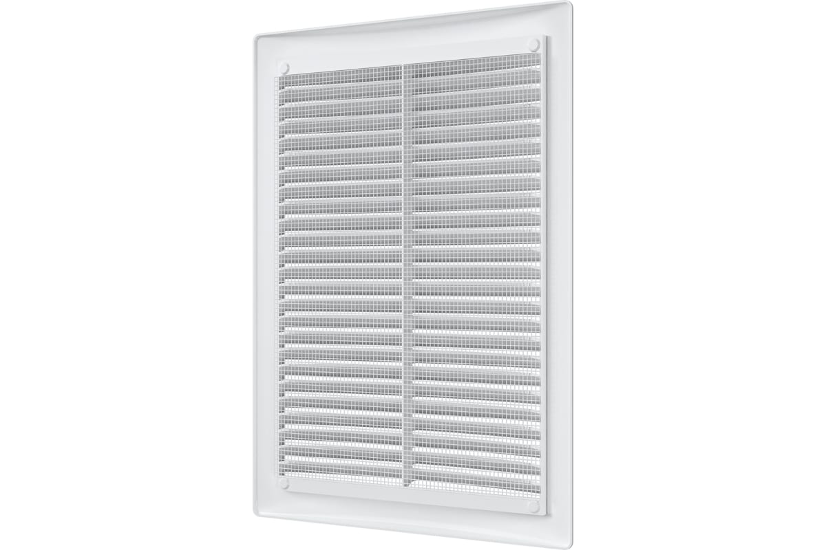 Вентиляционная решетка имеет наклонные жалюзи и оснащена защитной сеткой от насекомых.