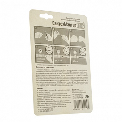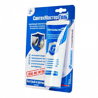 Герметик «СантехМастерГель» синий — гель-герметик предназначенный для уплотнения резьбовых и фланцевых металлических соединений диаметром до 2 дюймов. Надежно герметизирует резьбу, полученное соединение устойчиво к различным средам, высокому давлению и вибрациям, обеспечивает защиту резьбы от коррозии. Полимеризация геля происходит внутри резьбы, в отсутствии кислорода. Продукт имеет СЭЗ на применение в системах с горячей и холодной питьевой водой.