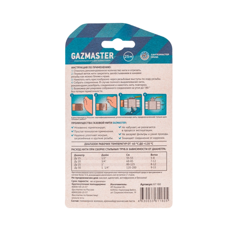 Нить Gazmaster 25 м - газовая уплотнительная нить для герметизации резьбовых соединений. Имеет плоское сечение, более 280 микронитей, пропитанных специальным герметизирующим составом, позволяющим быстро, надёжно и качественно уплотнить любое резьбовое соединение системы газоснабжения, расходуется экономично. При использовании этой полимерной подмотки материал не расходуется зря — не остается никаких лишних обрывков нити из-за удобной упаковки с острым ножом.