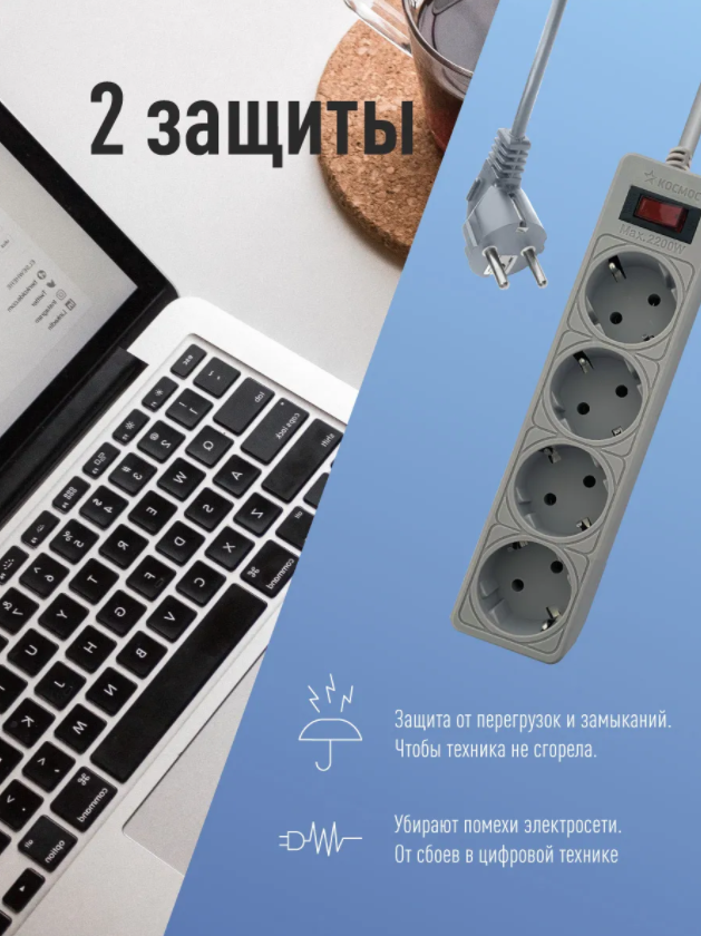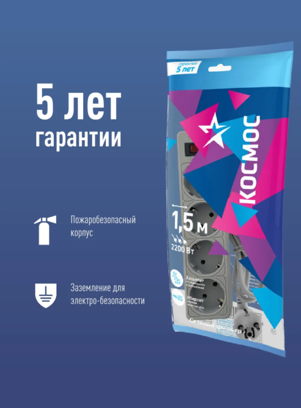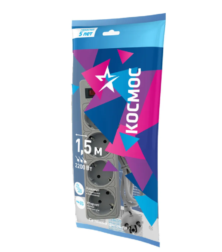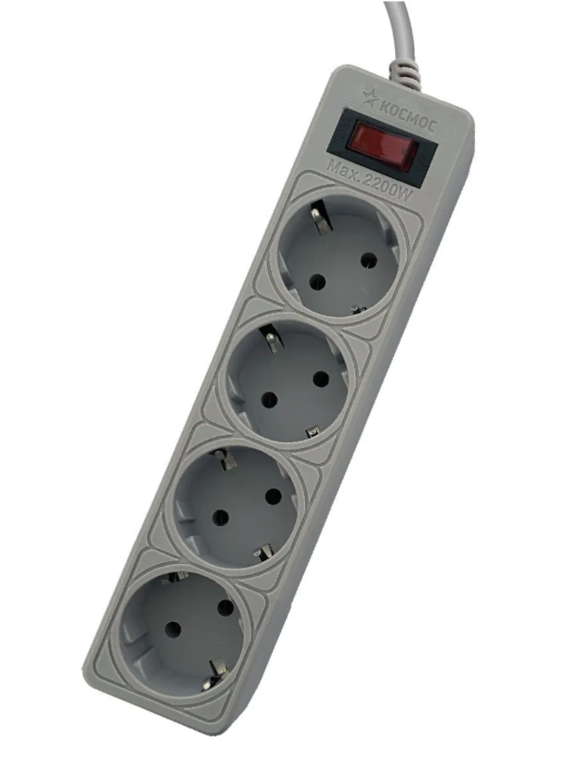 Сетевой фильтр Космос на 4 гнезда, длина провода - 1,5 м. Серый цвет. Защищает устройства от выхода из строя из-за некачественного тока: защита от перегрузок и замыканий многоразовой автоматикой; защита от импульсных помех, часто встречающихся в бытовой электросети. Лучше всего подходит для подключения чувствительной электроники: компьютеров, телевизоров, стереосистем и др. Максимальная мощность – 2200Вт, что достаточно для одновременного подключения 2 ноутбуков, телевизора, игровой приставки, и любого мощного устройства. Возможность крепления на стену. 100% медный 3-х жильный кабель с сечением 0,75мм, пожаробезопасный корпус . Индикатор сети. Номинальный ток 10А
