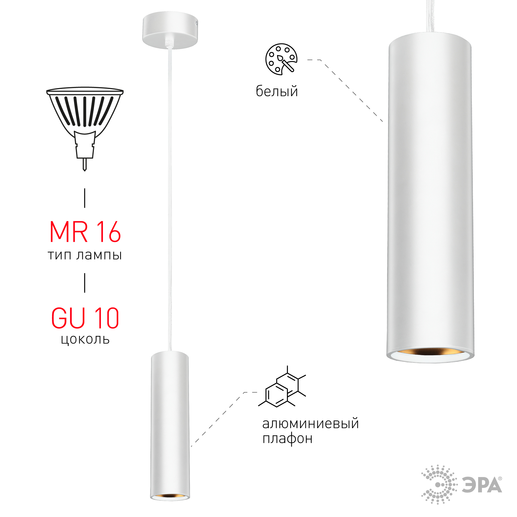 Светильник подвесной ЭРА PL1 GU10 WH 300, D80x300мм, белый IP20/707