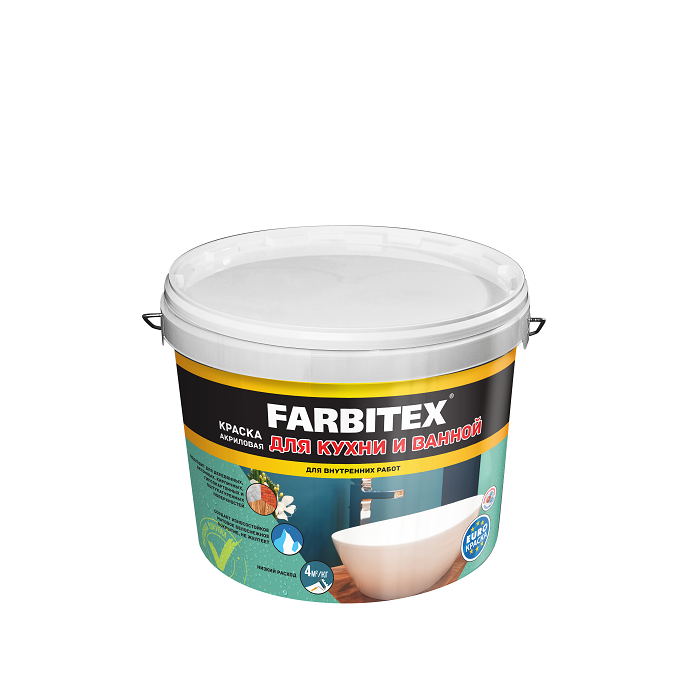 Краска акриловая для кухни и ванной FARBITEX- матовая водно-дисперсионная краска для окрашивания стен и потолков в жилых и общественных помещениях с повышенной влажностью воздуха и эксплуатационной нагрузкой.