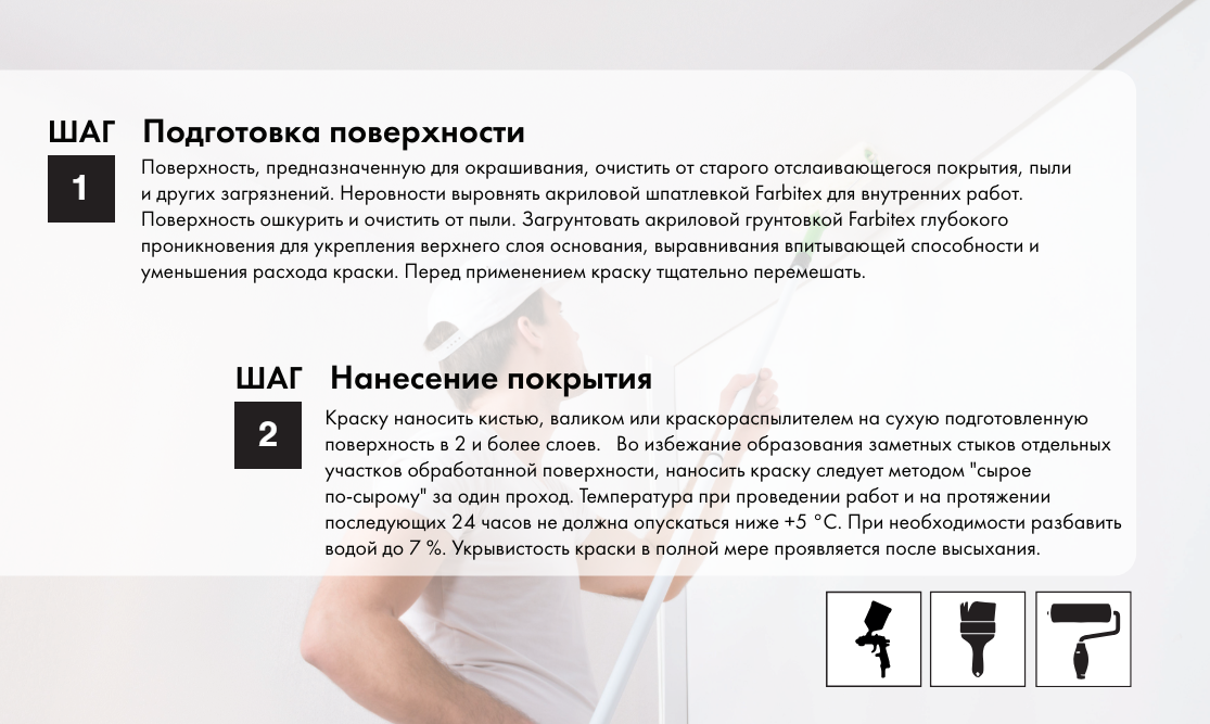 Качественная краска для окраски стен и потолков в жилых комнатах, холлах, залах, коридорах и других активно эксплуатируемых помещениях. Высококачественная водно-дисперсионная интерьерная краска произведена по технологиям компании ABC Фарбен.