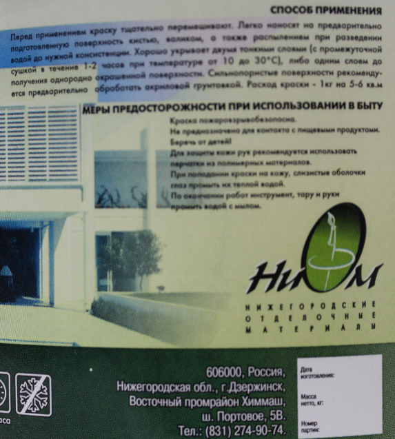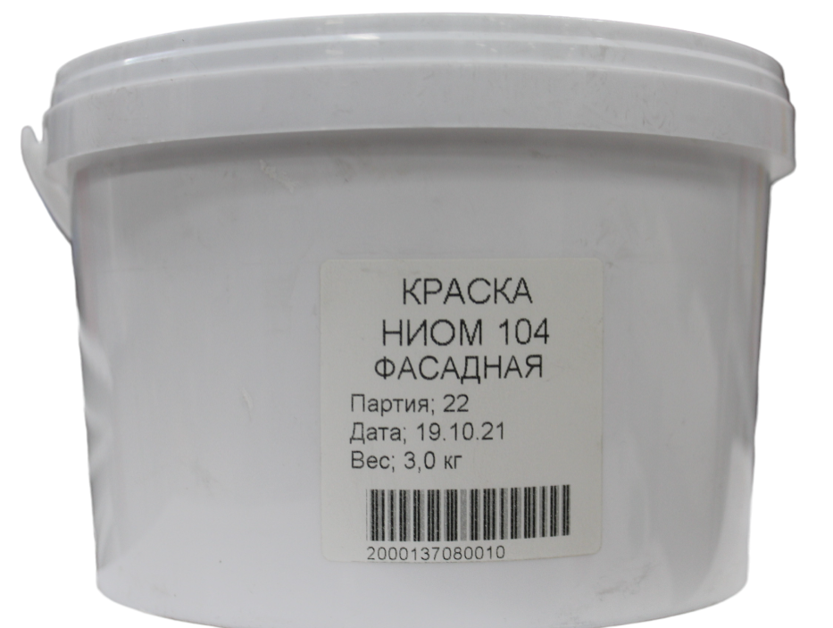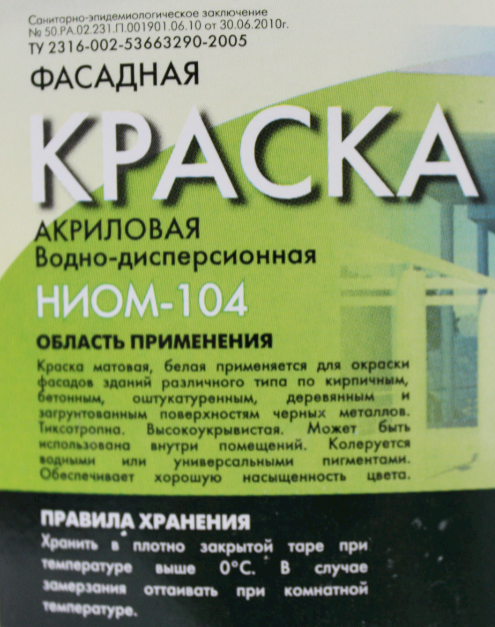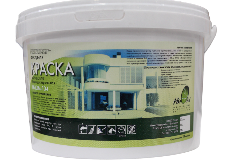 Краска фасадная водно-дисперсионная НИОМ-104 предназначена для качественной отделки различных поверхностей (бетон, ячеистый бетон, газосиликат, кирпич, древесина, гипс, различные минеральные штукатурки и др.) при ремонтно-строительных работах. Краска применяется для окраски стен фасадов, декоративных элементов зданий и других поверхностей, эксплуатируемых снаружи, а также и внутри помещений (окраска жилых комнат, больниц, детских учреждений, офисов, лестничных пролетов, производственных и складских помещений и т.п.). При высыхании образуется паропроницаемое, водостойкое и долговечное покрытие, устойчивое к агрессивным атмосферным воздействиям и к мытью с применением моющих средств. Свойства краски адаптированы к российскому климату. Качество подтверждено натурными испытаниями.,срок службы от 10 лет.