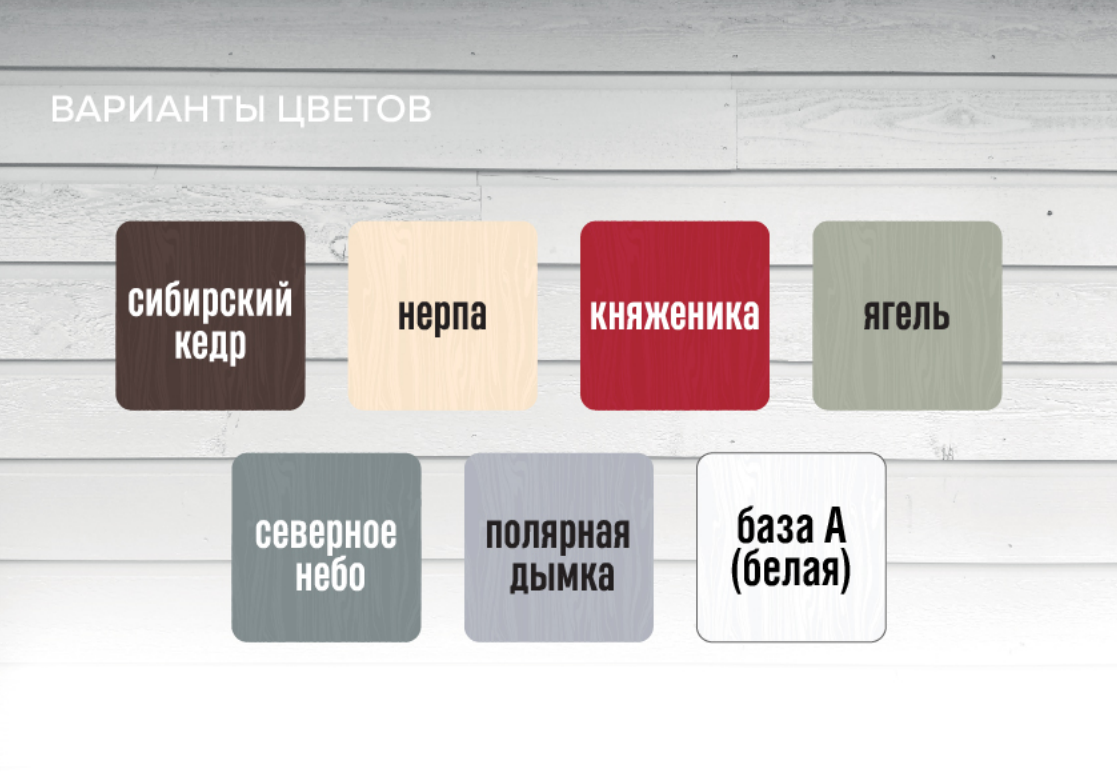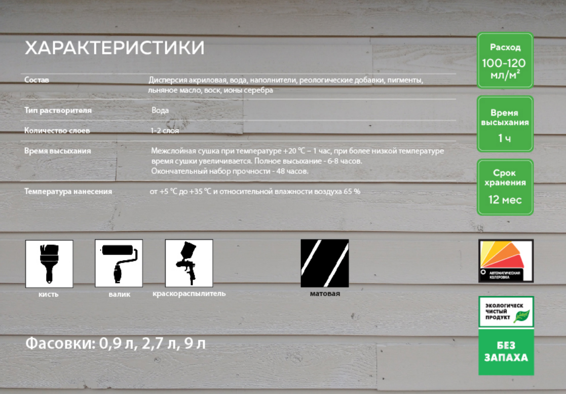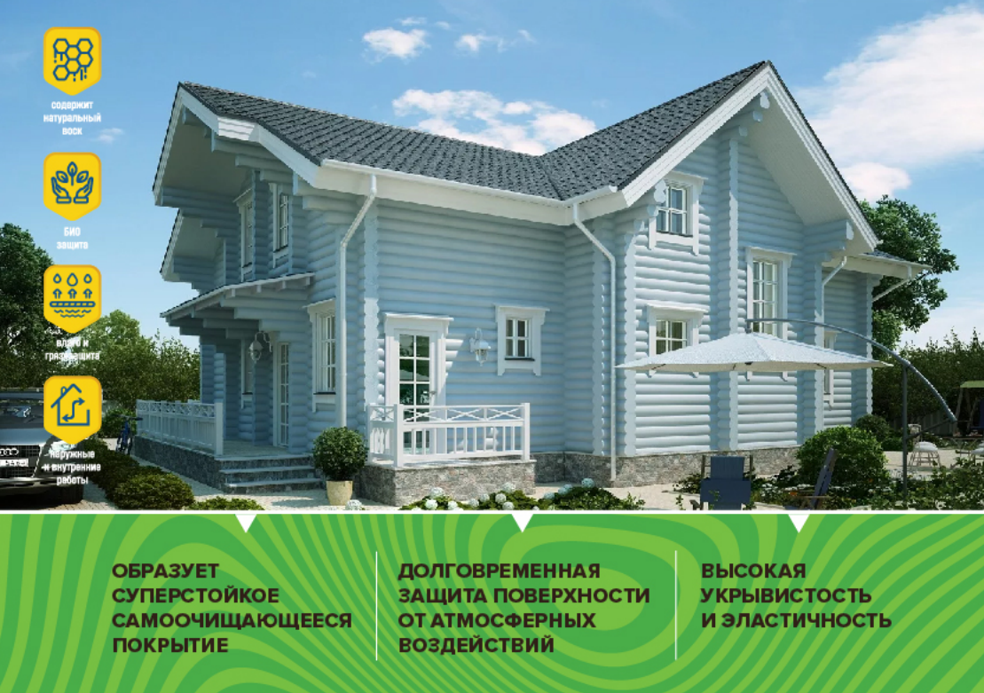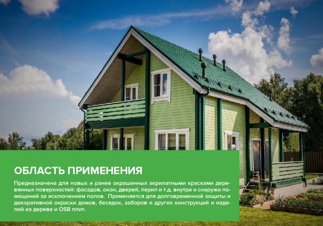 Высокоэффективная матовая краска на основе акриловой дисперсии для наружных и внутренних работ. Высокоукрывистая, экологически чистая, водоразбавляемая, с отличной адгезией к деревянным поверхностям. Образует покрытие с эффектом самоочищения под воздействием влаги и дождя. Выпускается в 6 готовых цветах+ База А (подходит для автоматической колеровки)