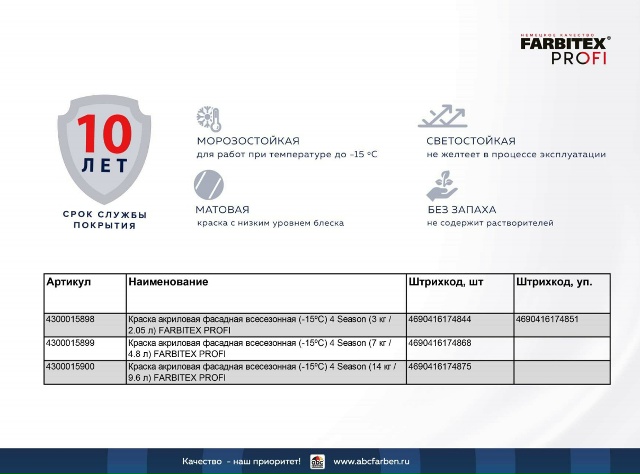 Краска в/д FARBITEX PROFI 4 Season фасадная акриловая всесезонная (-15ºС) 3кг