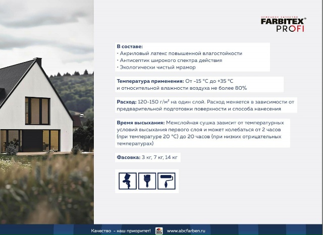 для высококачественной окраски фасадов и цоколей зданий и сооружений, эксплуатируемых в суровых условиях, подверженных прямому попаданию осадков, резким перепадам температур, повышенному солнечному излучению, воздействию микроорганизмов и т.д. Подходит для окраски бетонных, оштукатуренных, газобетонных, кирпичных, деревянных поверхностей при температуре от - 15 ºС до + 35 ºС. Подходит для нанесения внутри производственных, складских и других помещений с высокой эксплуатационной нагрузкой, а также во влажных помещениях.