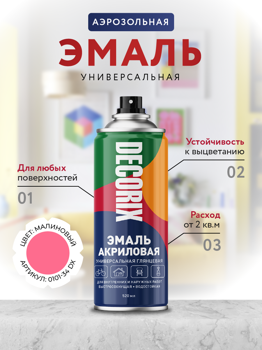 Универсальная акриловая эмаль DECORIX предназначена для бытового применения, декоративно-оформительских работ, строительства и ремонта. Идеально подходит для поверхностей из металла, древесины, бетона, камня, стекла, керамики и некоторых видов пластмасс.