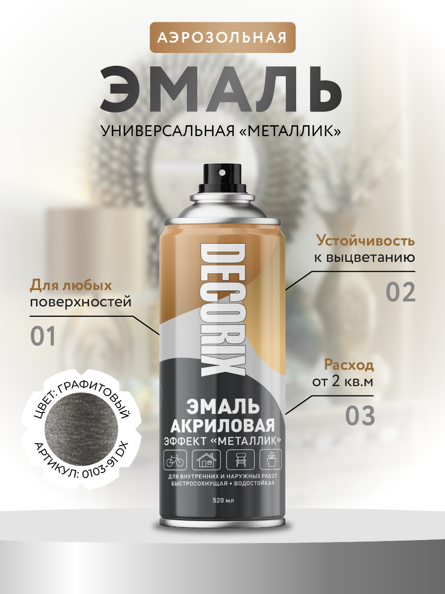 Высококачественная универсальная акриловая эмаль DECORIX с эффектом МЕТАЛЛИК предназначена для бытового применения, декоративно-оформительских работ, строительства и ремонта. Идеально подходит для поверхностей из металла, древесины, бетона, камня, стекла, керамики и некоторых видов пластмасс.