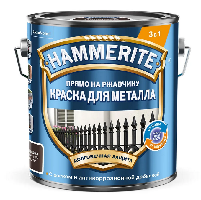 Краска для металла гладкая глянцевая прямо по ржавчине Hammerite с формулой 3 в 1 (грунт, ингибитор коррозии, финишное покрытие). Имеет в своем составе антикоррозийные и силиконовые добавки. Применяется для цветных и черных металлов, легко и быстро защищает металл от ржавчины, придает красивый внешний вид поверхности. Краска свободно наносится и гарантирует прочное антикоррозийное покрытие и эффективную защиту от ржавчины на протяжении 8 лет.