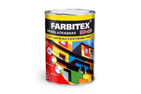 Эмаль алкидная ПФ 115 Farbitex, для дерева, металла, бетона, универсальная, для окраски внутри и снаружи помещений. Отличается особыми защитными и декоративными свойствами. Покрытие, состоящее из двух слоев эмали, нанесенное на подготовленную, загрунтованную поверхность, в умеренном и холодном климате сохраняет свои защитные свойства до 3 лет. Время высыхания каждого слоя при t 20С - не более 24 ч. Полное высыхание - 48 ч. Полное отверждение (окончательный набор прочности) - 4-5 суток. Температура нанесения не ниже +5С. Поверхность, предназначенную для окраски, очистить от пыли, ржавчины, окалины, жировых и др. загрязнений. Перед применением эмаль тщательно перемешать, при необходимости разбавить уайт-спиритом, скипидаром или смесью растворителей не более 5% от объема краски. Эмаль наносить методом распыления или кистью на подготовленную сухую, чистую поверхность. Расход 100-180 г/м2.