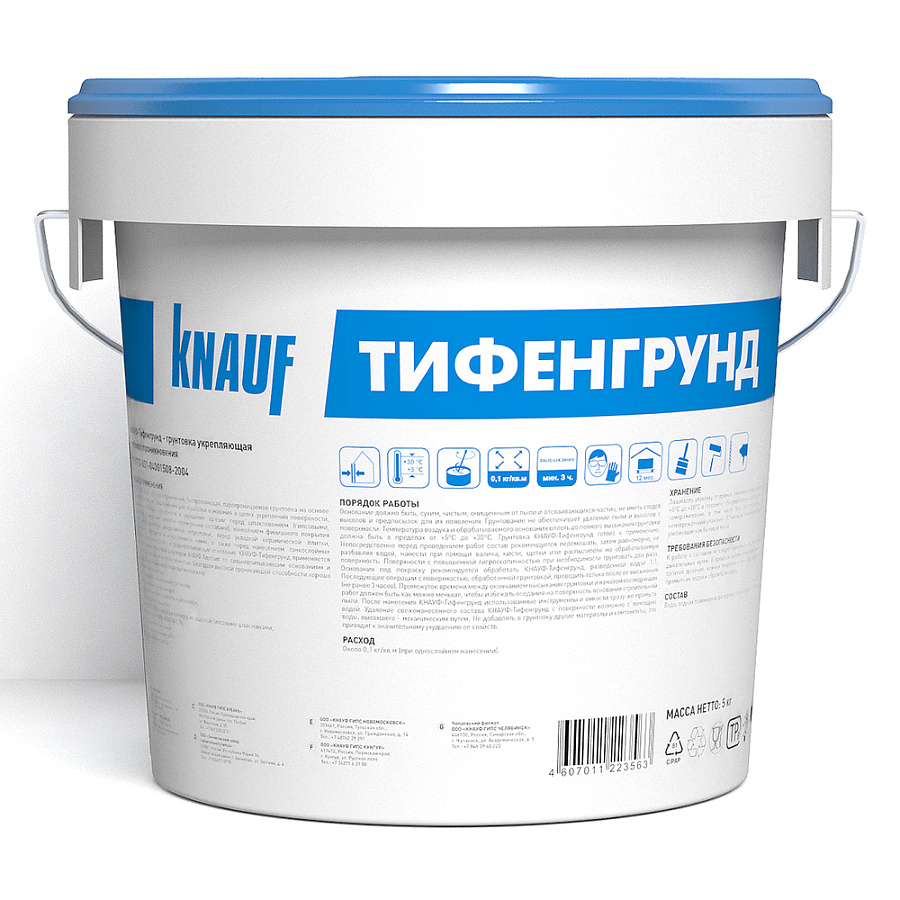 Грунтовка КНАУФ-ТИФЕНГРУНД предназначена для обработки основания в целях укрепления поверхности, снижения ее впитываемости и улучшения адгезии финишного покрытия (шпаклевки, краски, обои, облицовочной плитки и т.п.). Благодаря высокой проникающей способности подходит для грунтования мелкопористых материалов.