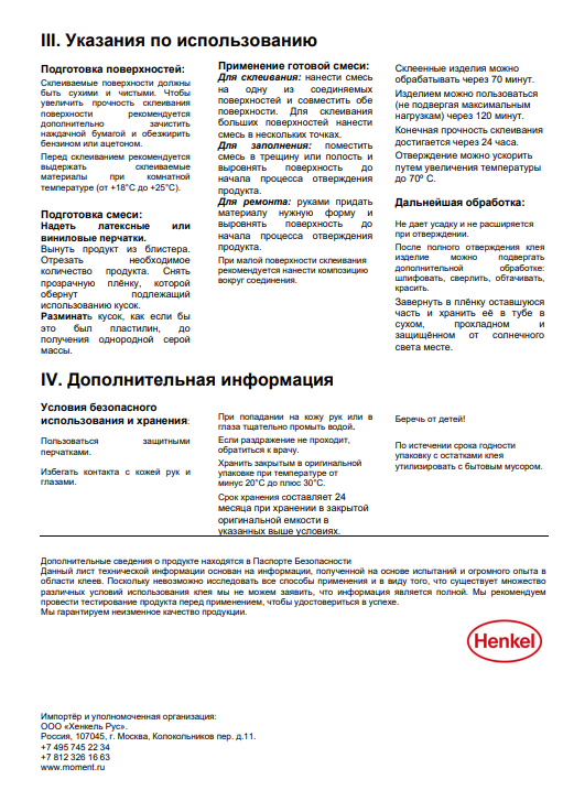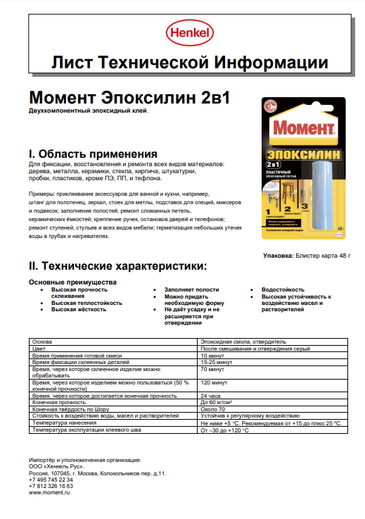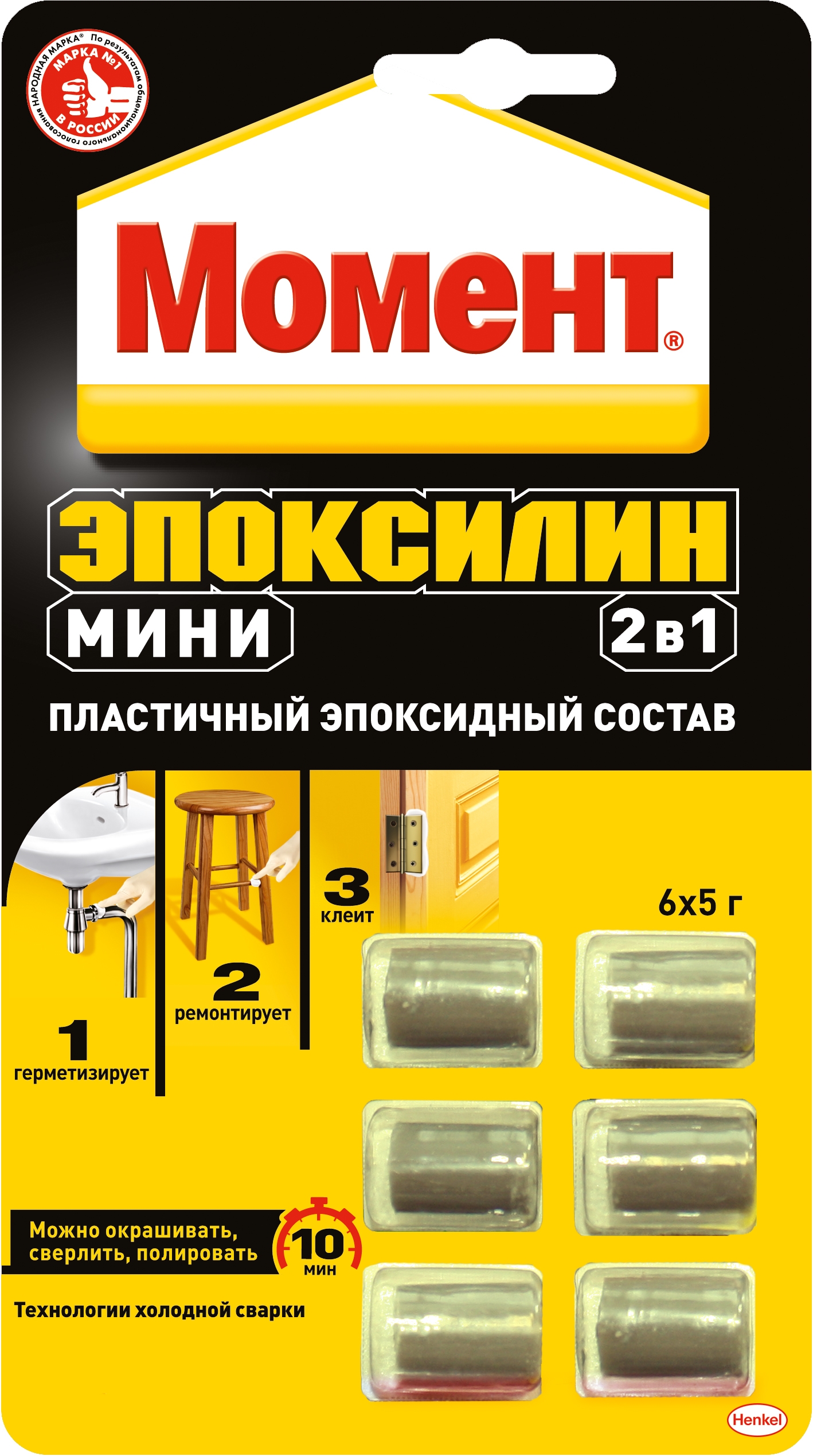 Пластичный двухкомпонентный состав «Момент Эпоксилин 2 в 1» позволяет склеивать, герметизировать, реставрировать различные материалы - древесину, металл, керамику, кирпич, пробку, мрамор, стекловолокно, пластики кроме ПЭ, ПП, тефлона.