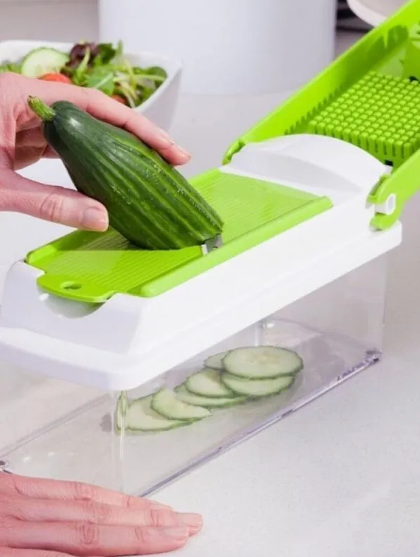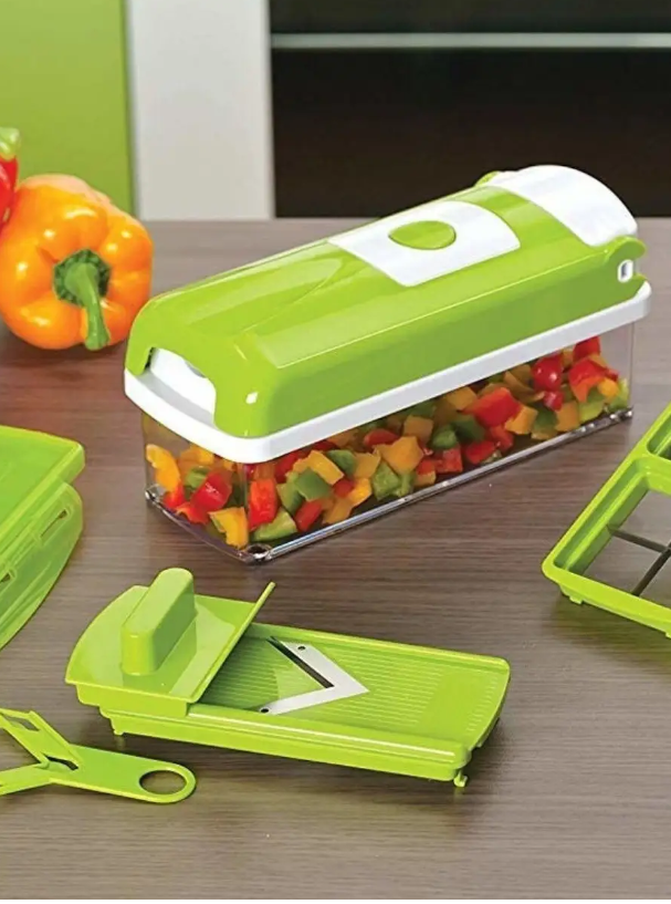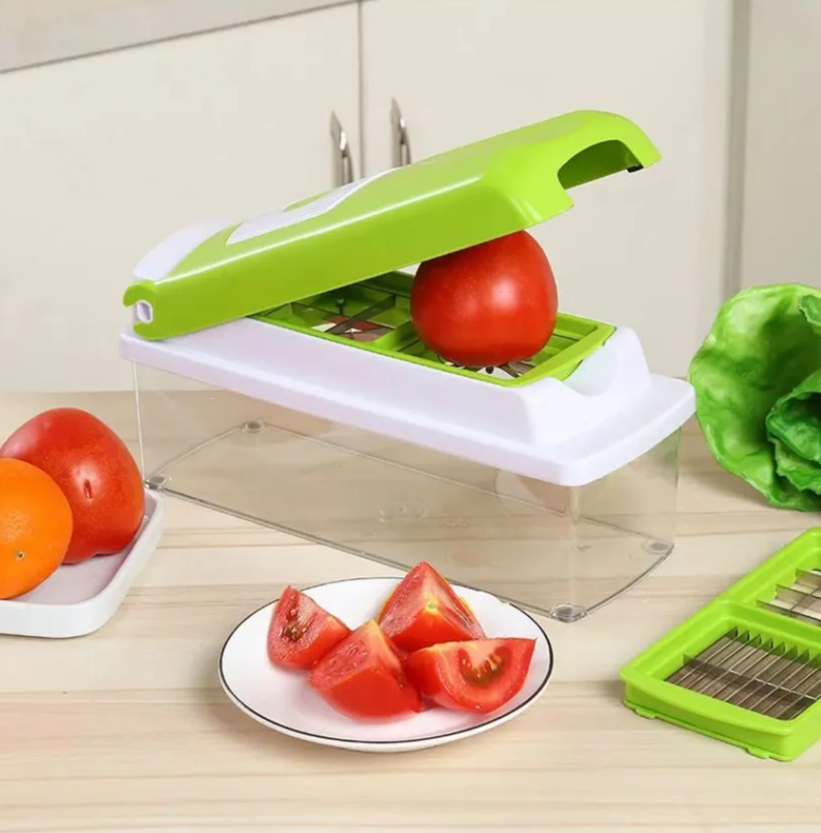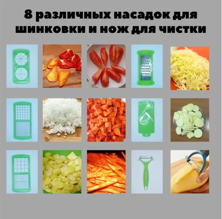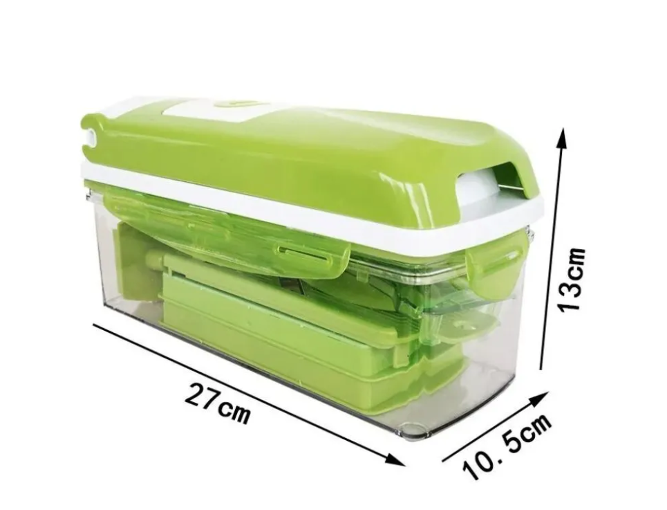 Незаменимая помощница на кухне, с помощью которой можно быстро и легко натереть или нарезать продукты, разрезать овощи и фрукты на четыре или восемь кусочков, а также сделать аккуратные кубики, соломку или нарезать ломтики для украшения стола. Отличительные особенности: - Механическая система - 14 кухонных предметов в одном - Сборная конструкция - Противоскользящие ножки - Сборочный контейнер с герметичной крышкой объёмом 1,5 л Овощерезка сочетает в себе ломтерезку, резак, тёрку и овощечистку. Она идеально подходит для фруктов, овощей и мяса. Лезвия из нержавеющей стали сконструированы таким образом, чтобы фрукты и овощи с кожурой не сминались при нарезании и не застревали в них. Овощерезка имеет контейнер для сбора овощей. Герметичная крышка позволит Вам хранить продукты прямо в контейнере. Замените множество предметов одним!