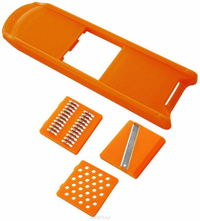 В комплект входит корпус-основа и три насадки. Слайсер ножами-вставками из металла используется для нарезки овощей ломтиками и шинковки капусты. Вторая насадка применяется для приготовления пюре из мягких овощей и фруктов. С помощью третьей нарезается корейская морковь, соломка из кабачков, свеклы, редьки, огурцов.