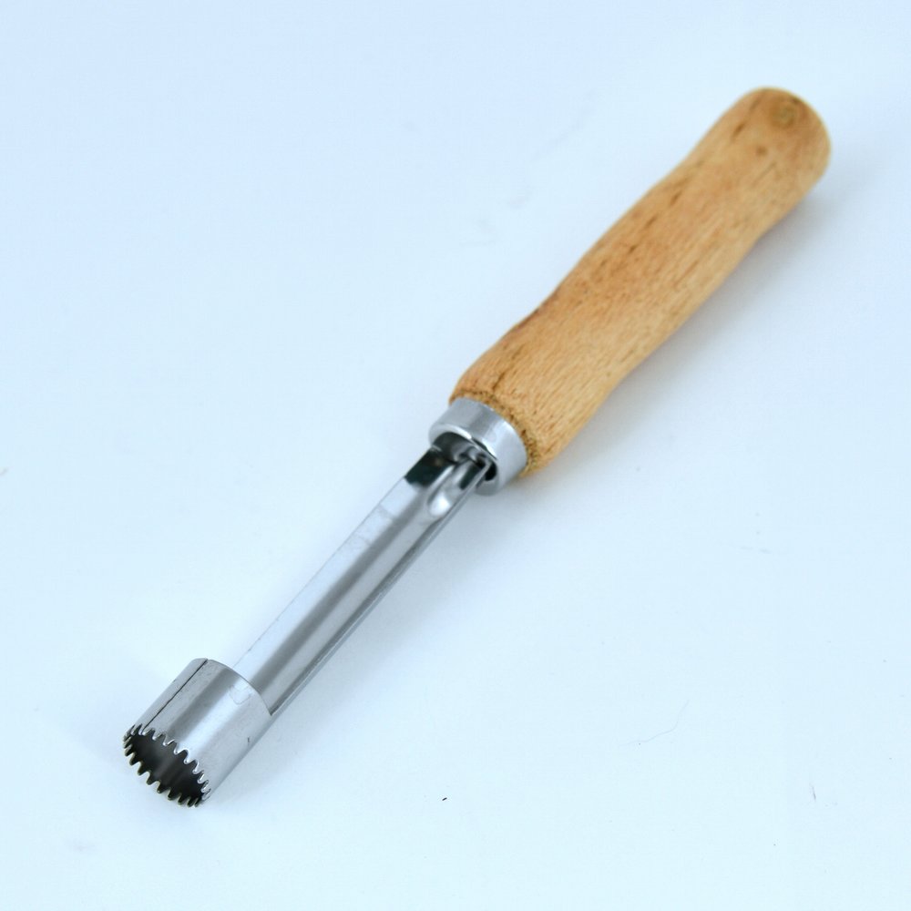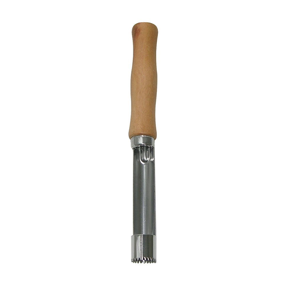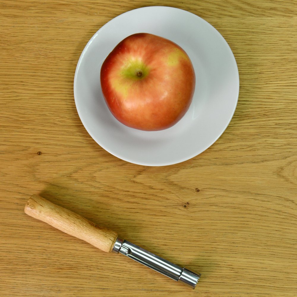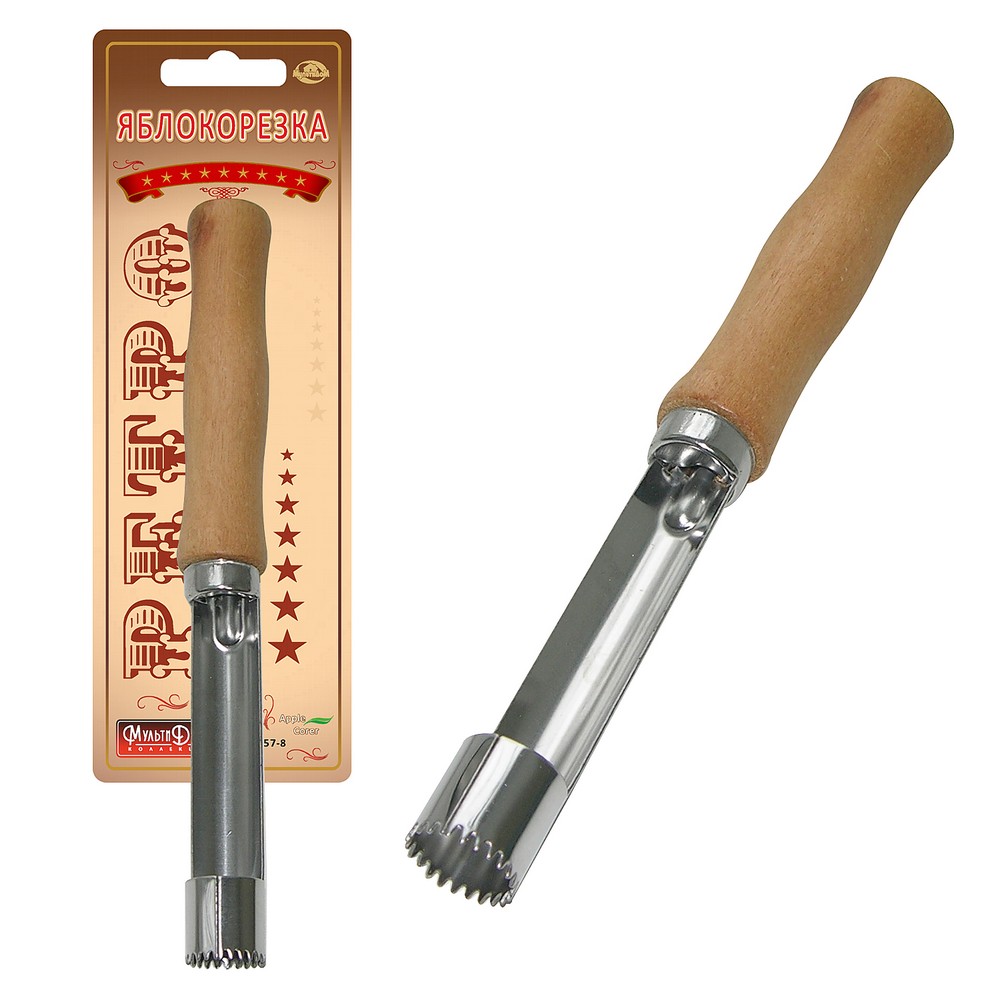 Почистить яблоко не так уж и сложно, но, когда нужно переработать большой объем фруктов или приготовить яблоки для детей, на помощь приходит яблокорезка «Ретро». Инструмент аккуратно удаляет сердцевину и подходит для плодов любого размера. Изделие работает по принципу пробойника — вы ставите его зубчатым концом в область плодоножки и продавливаете на всю длину, затем вытаскиваете лезвие вместе с сердцевиной. Если яблоко твердое, можно прокрутить вокруг своей оси для более легкого извлечения. Изготовлено: рабочая часть из коррозионностойкой (нержавеющей) стали, ручка из дерева. После применения вымыть мягкой щеткой или губкой, можно с использованием жидких моющих средств.
