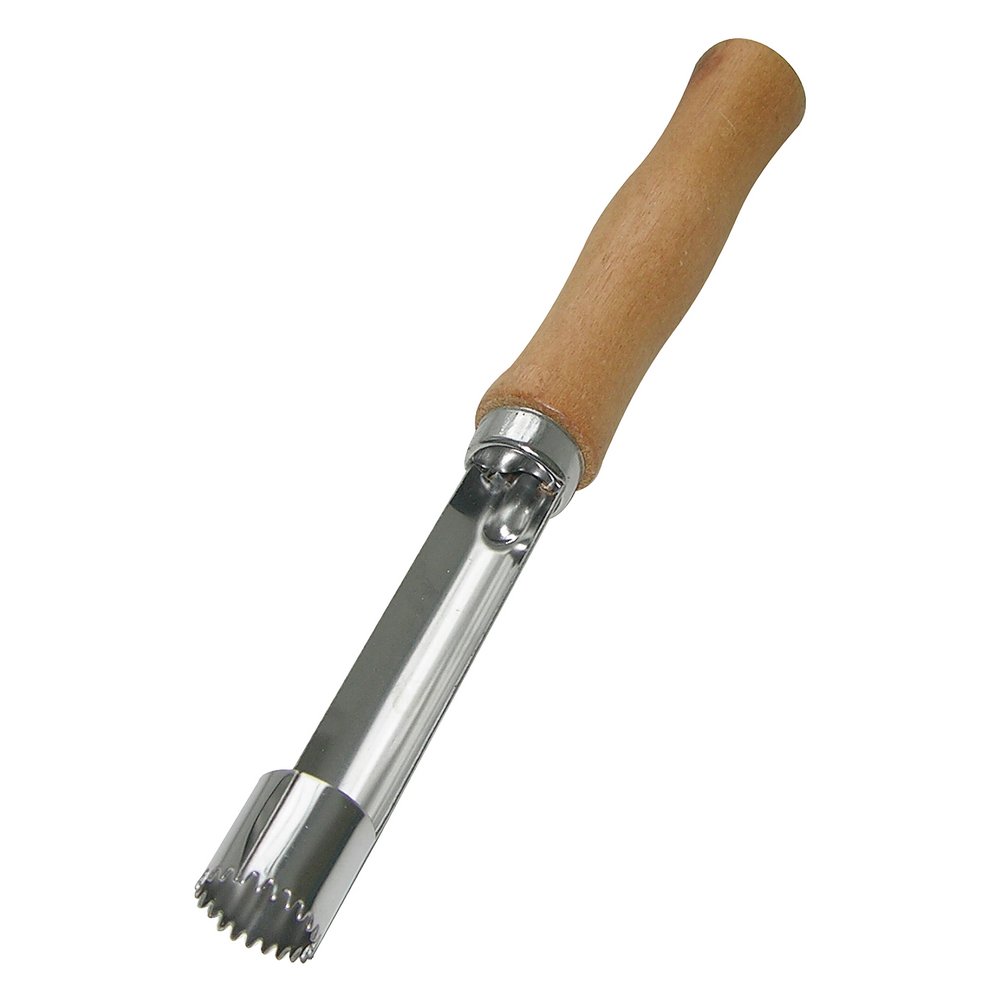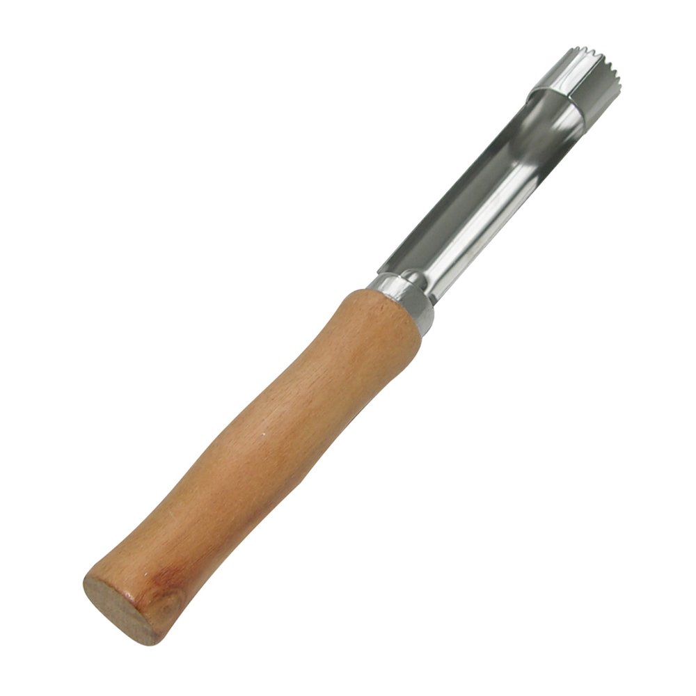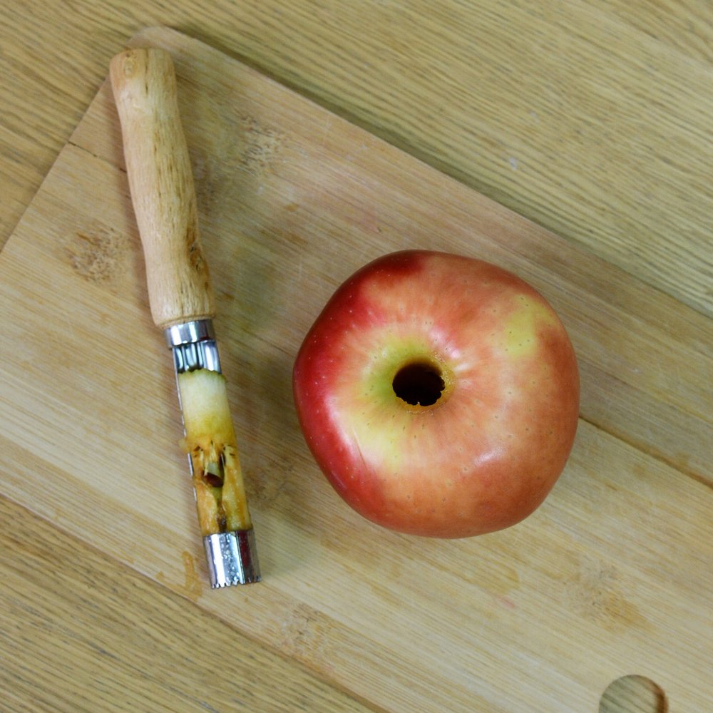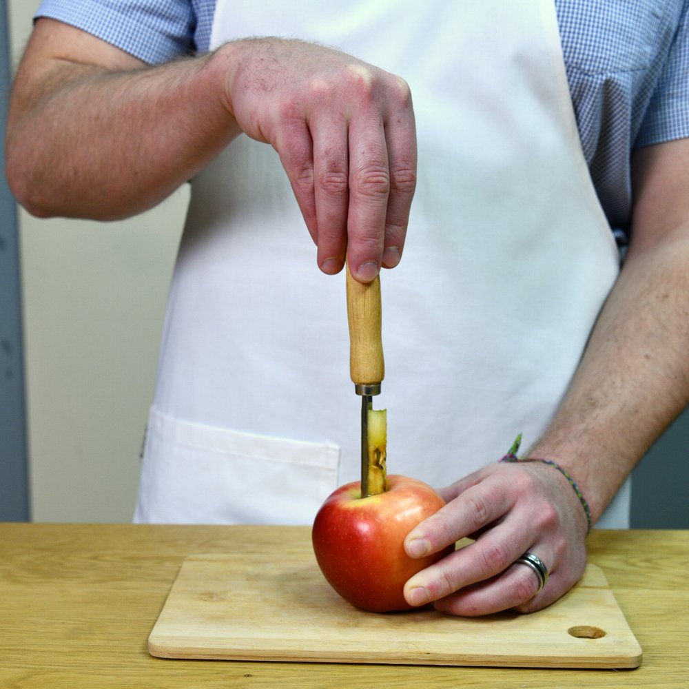 Почистить яблоко не так уж и сложно, но, когда нужно переработать большой объем фруктов или приготовить яблоки для детей, на помощь приходит яблокорезка «Ретро». Инструмент аккуратно удаляет сердцевину и подходит для плодов любого размера. Изделие работает по принципу пробойника — вы ставите его зубчатым концом в область плодоножки и продавливаете на всю длину, затем вытаскиваете лезвие вместе с сердцевиной. Если яблоко твердое, можно прокрутить вокруг своей оси для более легкого извлечения. Изготовлено: рабочая часть из коррозионностойкой (нержавеющей) стали, ручка из дерева. После применения вымыть мягкой щеткой или губкой, можно с использованием жидких моющих средств.