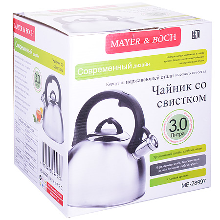 Чайник MAYER&BOCH изготовлен из высококачественной нержавеющей стали (CrNi 18/10). Изделия из нержавеющей стали не окисляются и не впитывают запахи, благодаря чему вы всегда получите натуральный, насыщенный вкус и аромат напитков. Капсулированное дно с прослойкой из алюминия обеспечивает наилучшее распределение тепла. Фиксированная эргономичная ручка выполнена из бакелита, также на ручке расположена клавиша механизма открывания носика. Носик чайника оснащен насадкой-свистком, который позволяет контролировать процесс кипячения или подогрева воды. Поверхность чайника гладкая, что облегчает уход за ним. Эстетичный и функциональный, с современным дизайном, чайник будет замечательно смотреться на любой кухне. Подходит для использования на всех типах плит, включая индукционные. Подходит для мытья в посудомоечной машине.