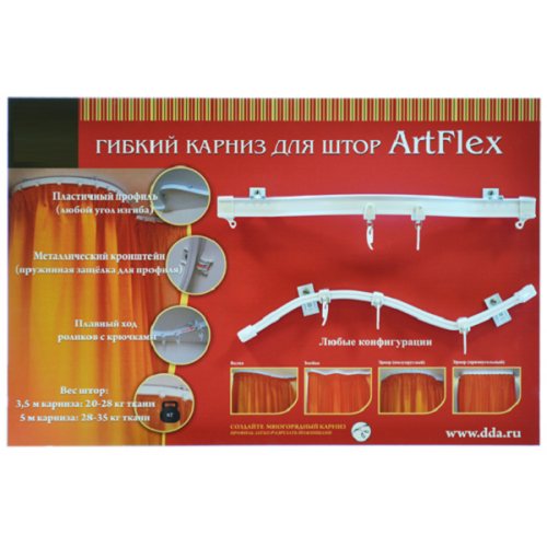 Гибкий карниз Артфлекс продается в упаковках по 3,5 и 5 м. Он очень пластичен, легко гнется, подходит для эркеров, угловых окон, а так же любых других форм. В комплектацию входит все необходимое для крепления к потолку и навески штор.