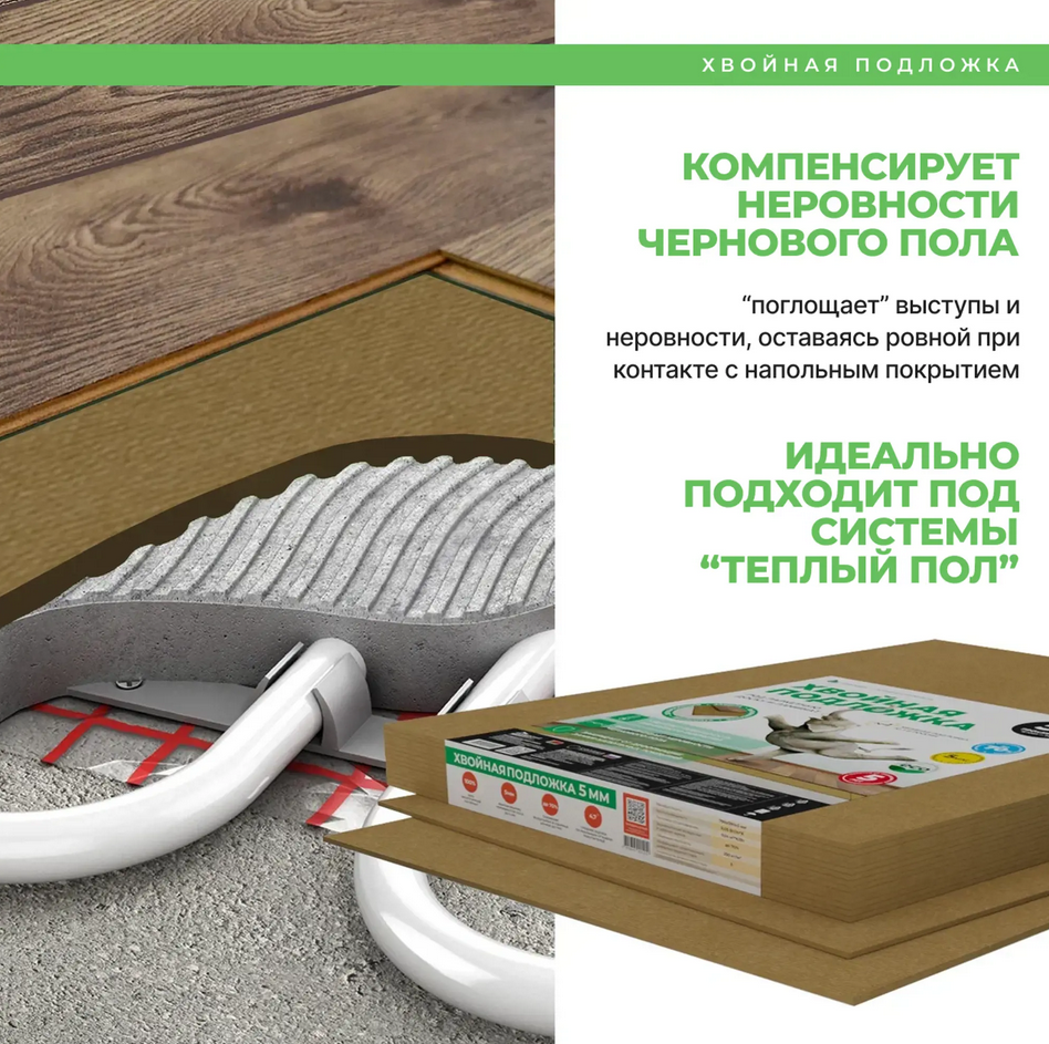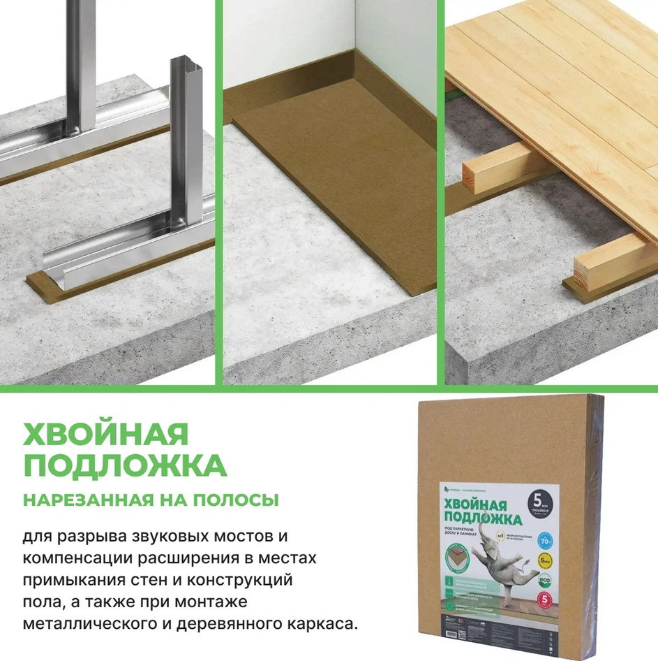 Структура и плотность материала обеспечивают эффективную звуко- и теплоизоляцию, компенсируют неровности основания до 2 мм.