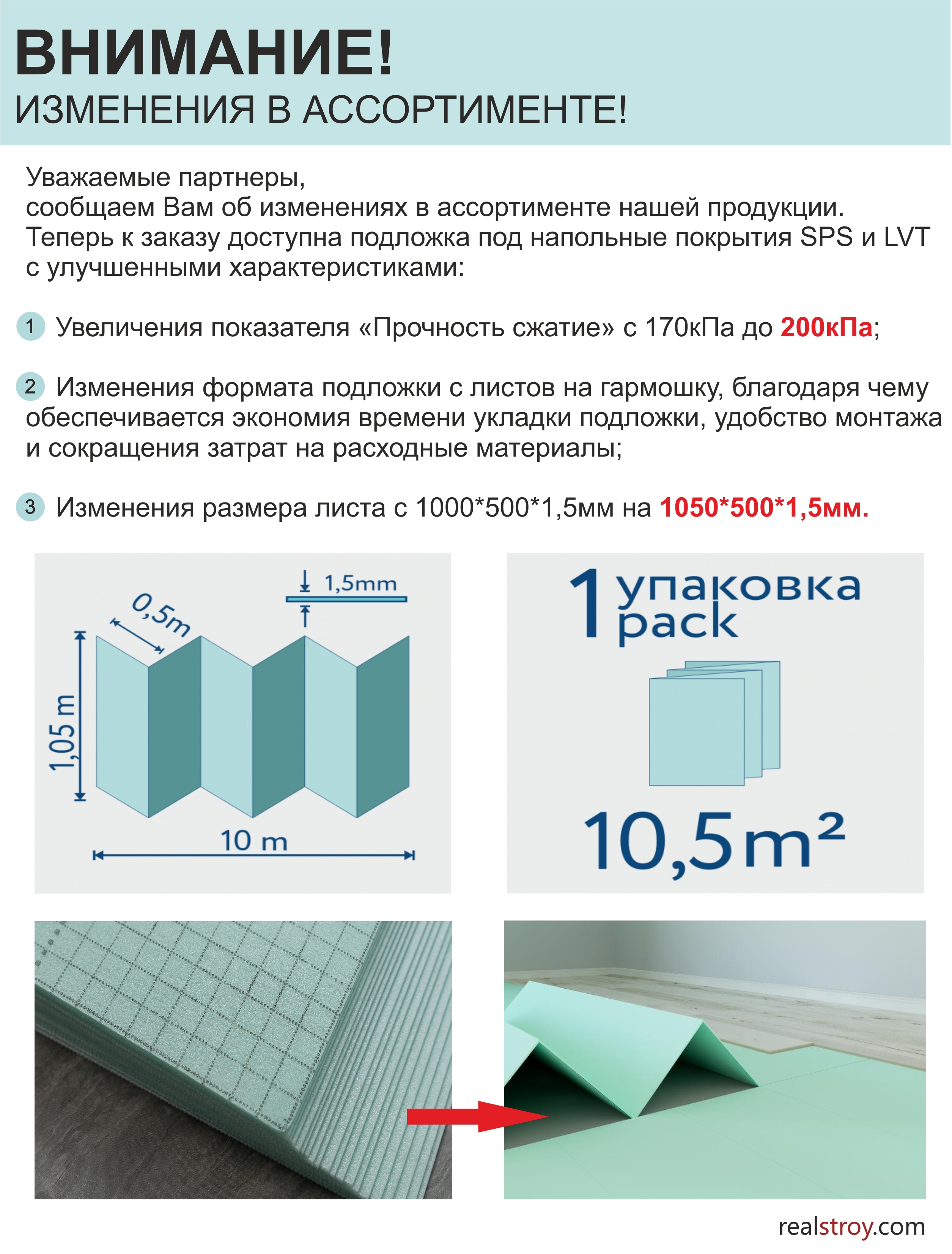 Подложка-гармошка под LVT/SPC/WPC Solid, 1050x500x1,5 мм, 10,5 кв.м, зеленая, разработана для обустройства винилового ламинированного пола с системой Click. Материал выполняют из листового полистирола с помощью технологии экструзии. Продукт толщиной 1,5 мм устойчив к нагрузке 12 т/м2. Толщина полотна составляет 1,5 мм. Изделия характеризуются низким водопоглощением, высокой прочностью на сжатие, малой теплопроводностью, долговечностью. Длина плиты составляет 1,05 м.