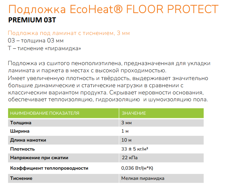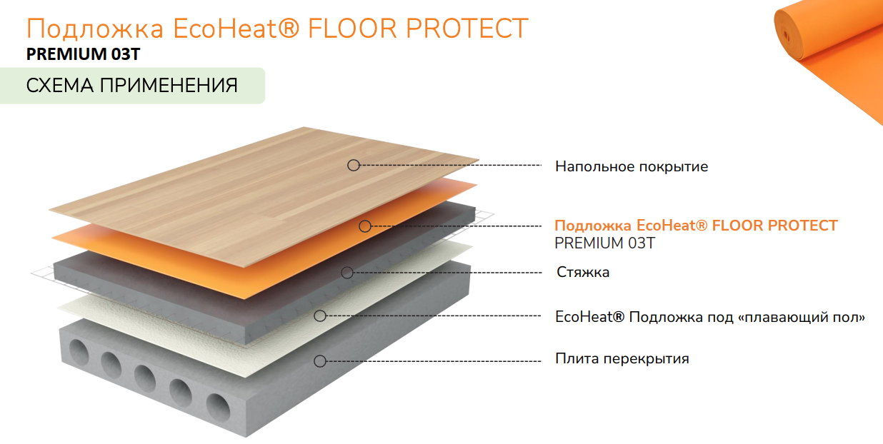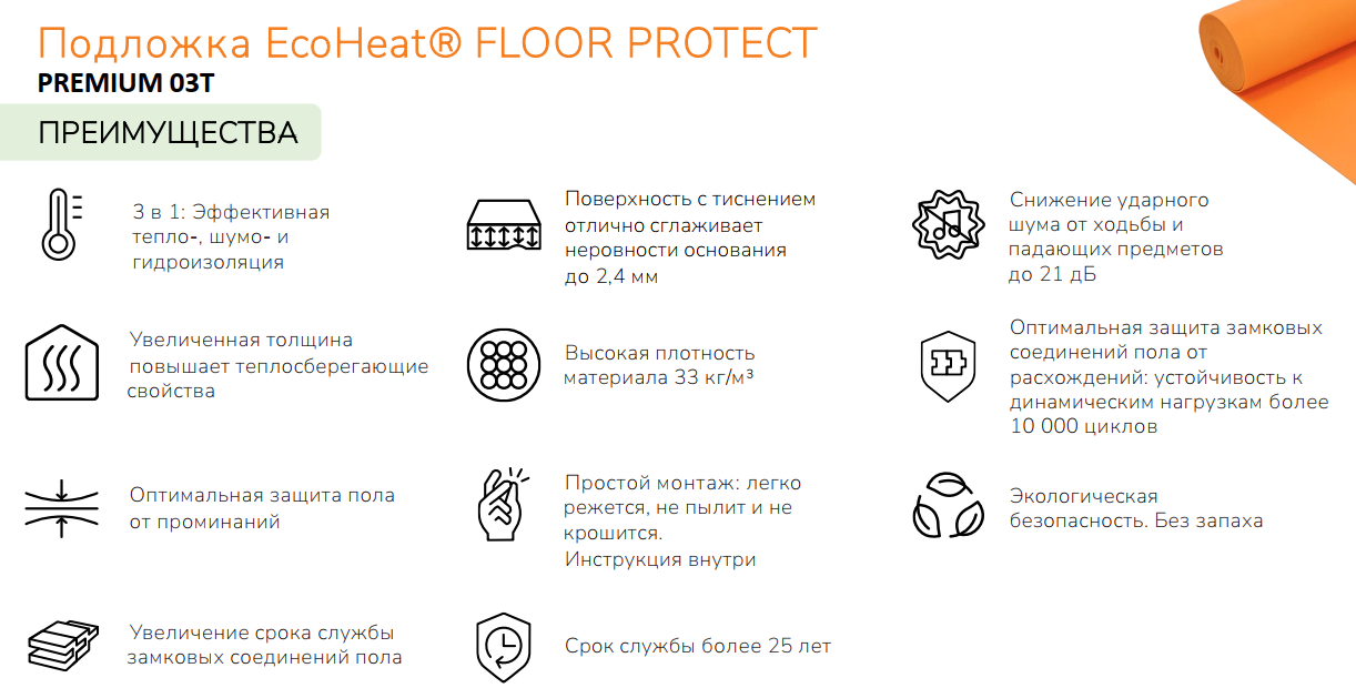 Подложка EcoHeat Floor Protect "Premium 03T" 3мм, рулон 1х10м (10 кв.м)