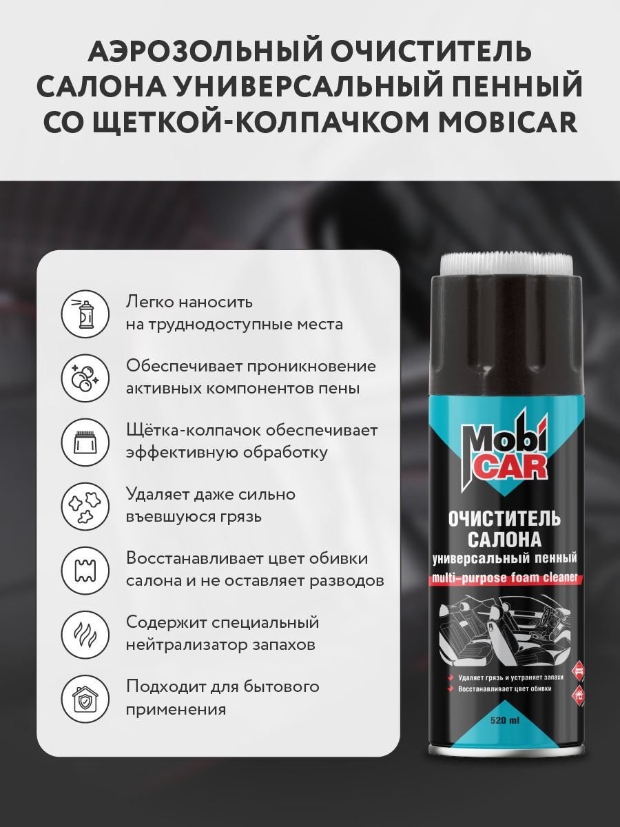 Профессиональный универсальный пенный очиститель салона MobiCAR® предназначен для лёгкого и быстрого удаления загрязнений различного происхождения с тканевой и велюровой обивки салона автомобиля.