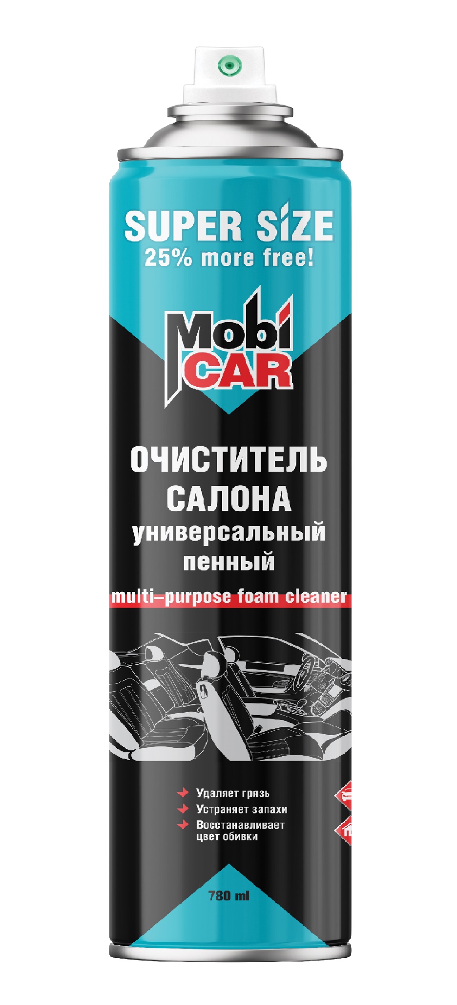 Профессиональный универсальный пенный очиститель салона MobiCAR® предназначен для лёгкого и быстрого удаления загрязнений различного происхождения с тканевой и велюровой обивки салона автомобиля.