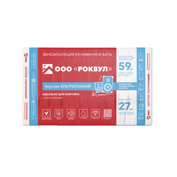 Утеплитель "Роквул" Акустик Ультратонкий 1000х600х27мм / 7,2м2 - 0,194м3 / 12 плит