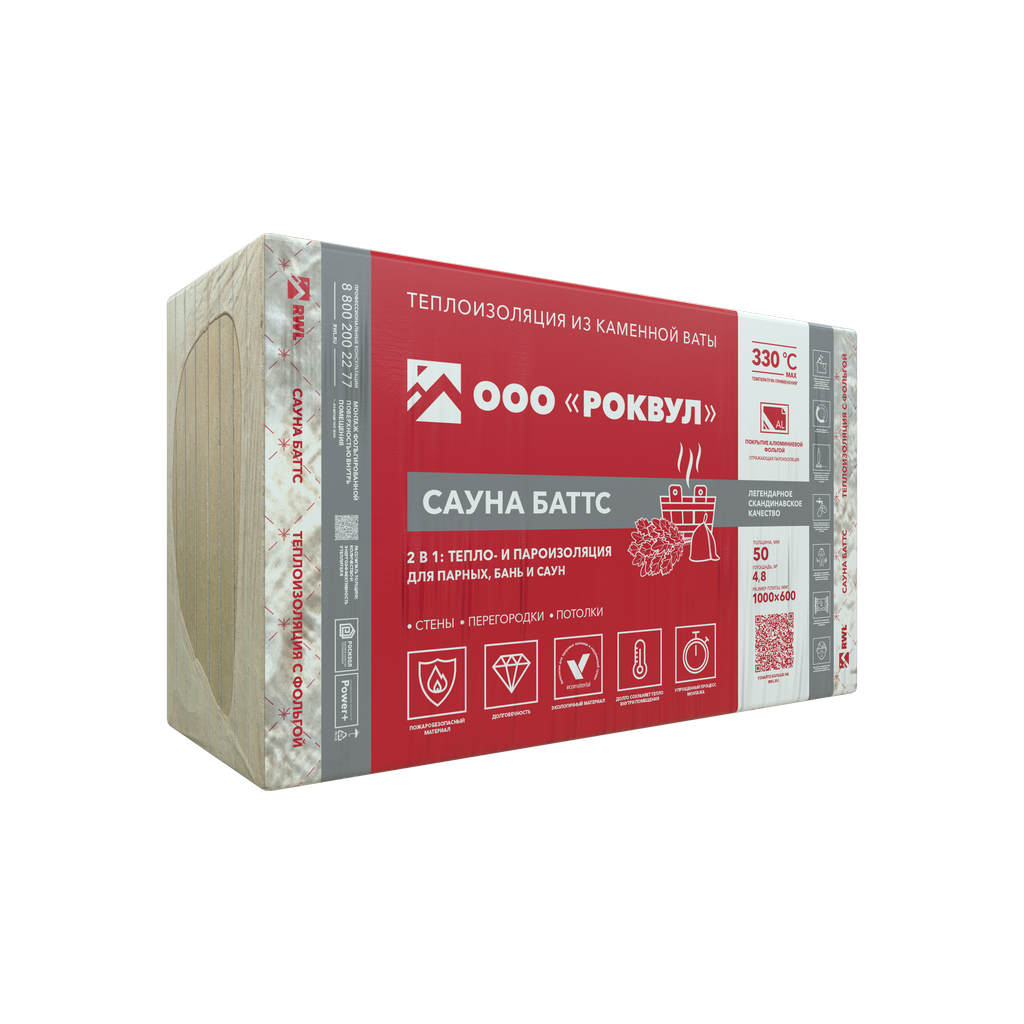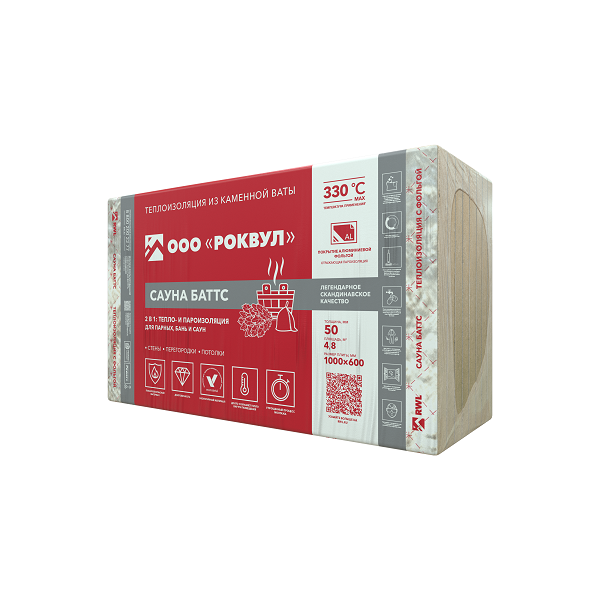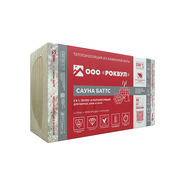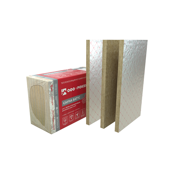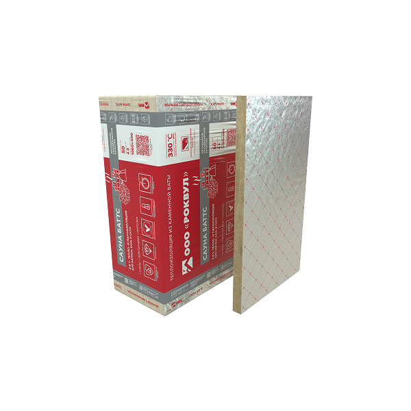 САУНА БАТТС - мягкие гидрофобизированные теплоизоляционные плиты, изготовленные из каменной ваты на основе базальтовых пород. Имеют покрытие из алюминиевой армированной фольги с одной стороны, выступающей в роли пароизоляционного и теплоотражающего слоя. Материал выдерживает высокую температуру — до +330 °С.