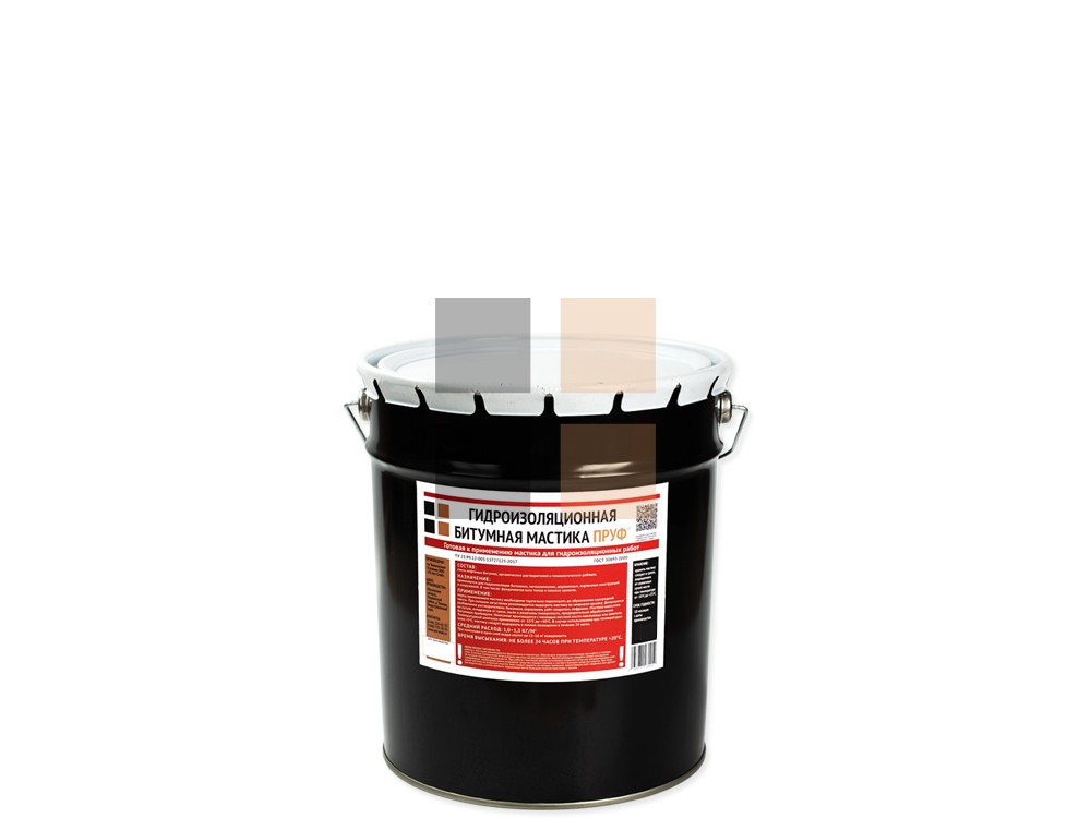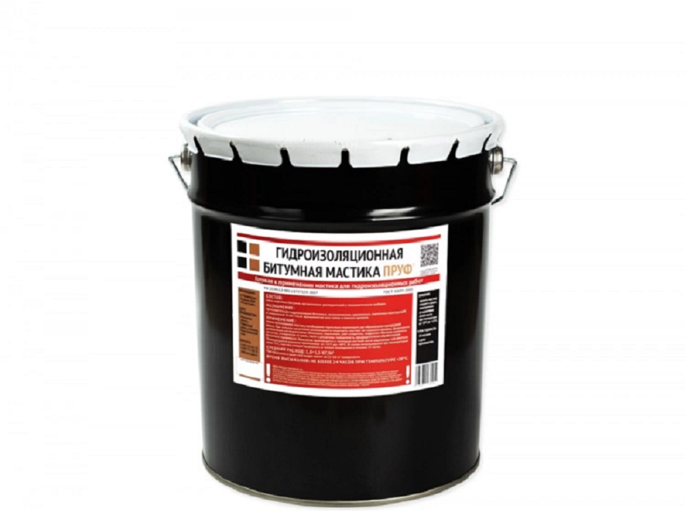 Битумная Гидроизоляционная Мастика Пруф представляет собой готовый к применению материал холодного отверждения на основе нефтяного битума, содержащий растворитель, пластификатор и технологические добавки.Применяется для гидроизоляции бетонных, металлических, деревянных, кирпичных конструкций и сооружений. Может использоваться при проведении кровельных работ, а также для приклеивания различных строительных материалов.Применяется для гидроизоляции бетонных, металлических, деревянных, кирпичных конструкций и сооружений. Может использоваться при проведении кровельных работ, а также для приклеивания различных строительных материалов.