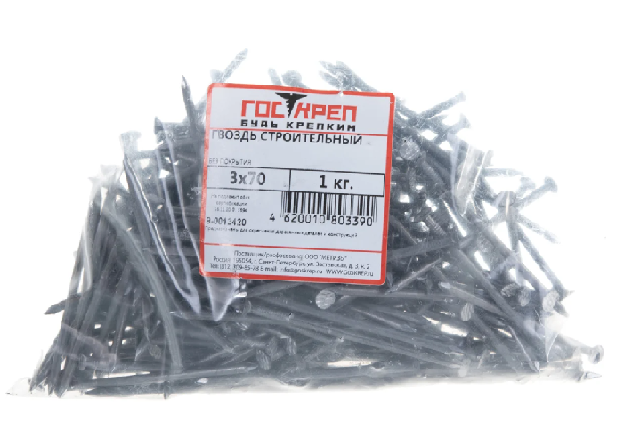 Гвоздь строительный 3,0х70 пакет (1кг) ГОСКРЕП используются для скрепления различных материалов, в основном деревянных, посредством забивания. Гвоздь представляет собой металлический стержень, с одной стороны заострен, а с другой имеет цилиндрическую головку для лучшего вбивания. Надежный гвоздь, не гнется при забивании.