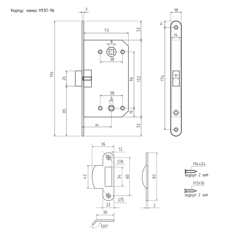 Корпус замка М13П-96 оснащен ригелем из ударопрочного пластика. Это обеспечивает бесшумное закрытие двери. Универсальный тип конструкции позволяет устанавливать изделие на левые и правые двери. Отверстие под квадрат ручки – 8х8 мм, под квадрат фиксатора – 6х6 мм. Лицевая планка изготовлена из стали и имеет 5-слойное гальваническое покрытие.