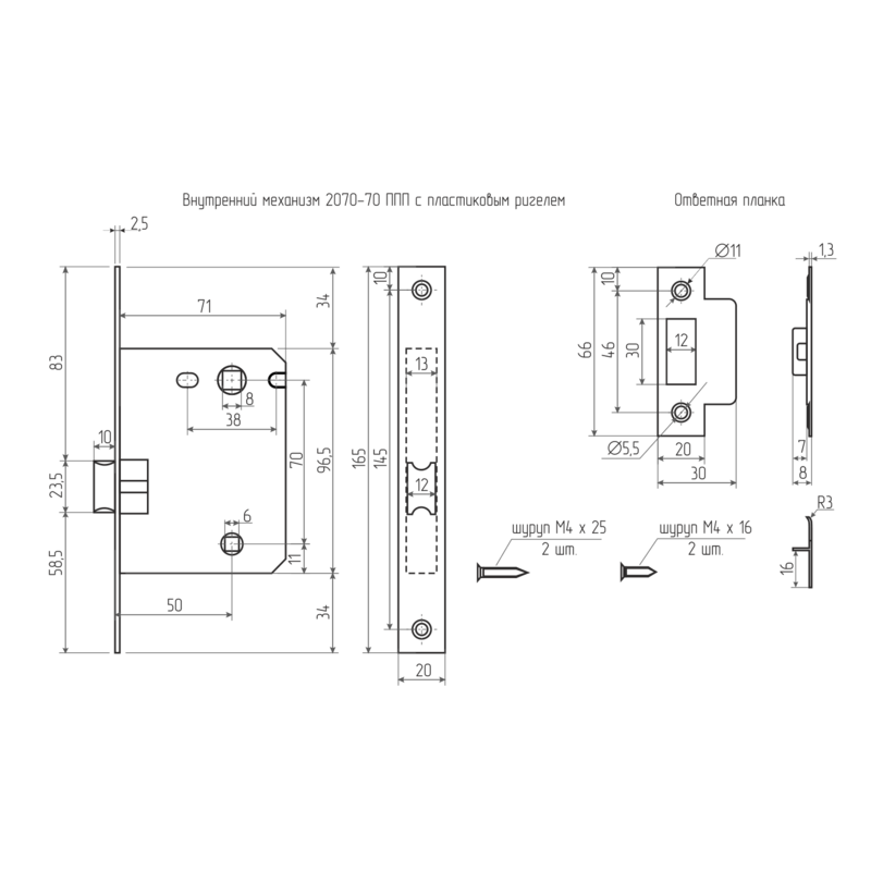 Внутренний механизм 2070-70 ППП с пластиковым ригелем предназначен для установки в межкомнатные деревянные двери.