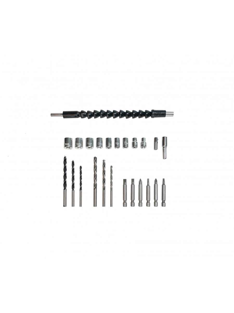 кейс; зарядное устройство; 2 Li-ion аккумулятора; Переходник для торцевых головок; Сверла по металлу - 3 шт; 6 бит + удлинитель для них; сверла по дереву - 3шт; торцовые головки - 9 шт