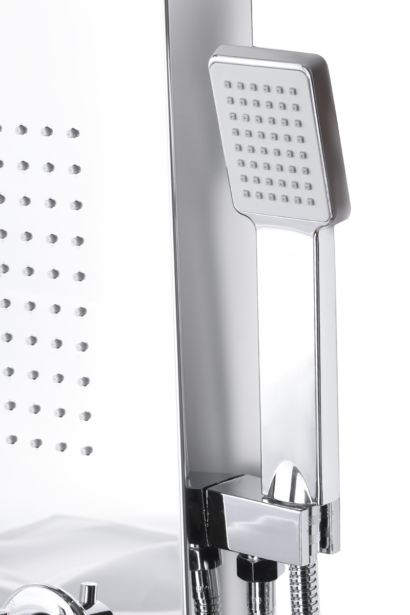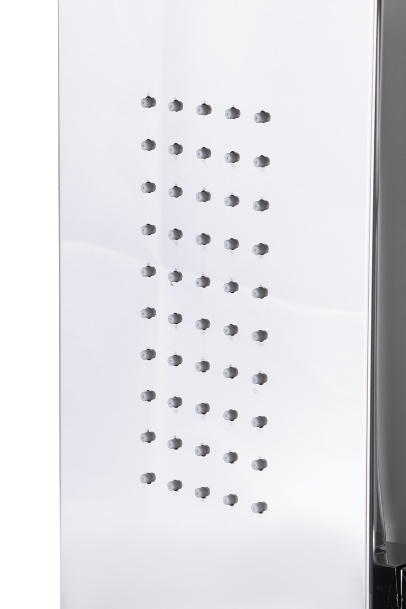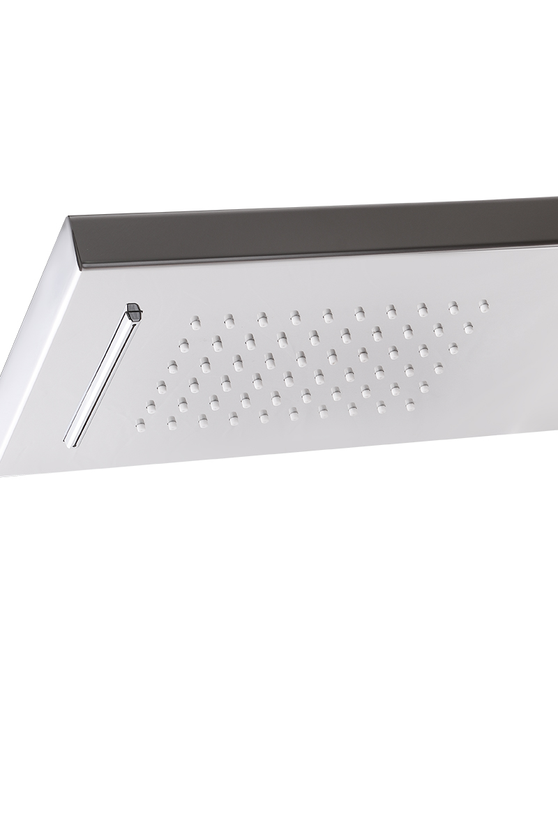Душевая панель с функцией гидромассажа. Душевая гидромассажная панель изготовлена из нержавеющей стали. Выполнена в современном эргономичном стиле, которая может стать центром вашей любимой ванной комнаты. У душевой панели имеется 5 режимов. Для регулировки воды применяется картридж 35мм. Верхний душ прямоугольной формы, фиксированный. На корпусе панели имеется держатель для душевой лейки. Душевая панель - позволяет не только принять душ, но и насладиться «объятиями» горячей воды, благодаря гидромассажным боковым форсункам. Душевая панель подходит для разных интерьеров ванных комнат.