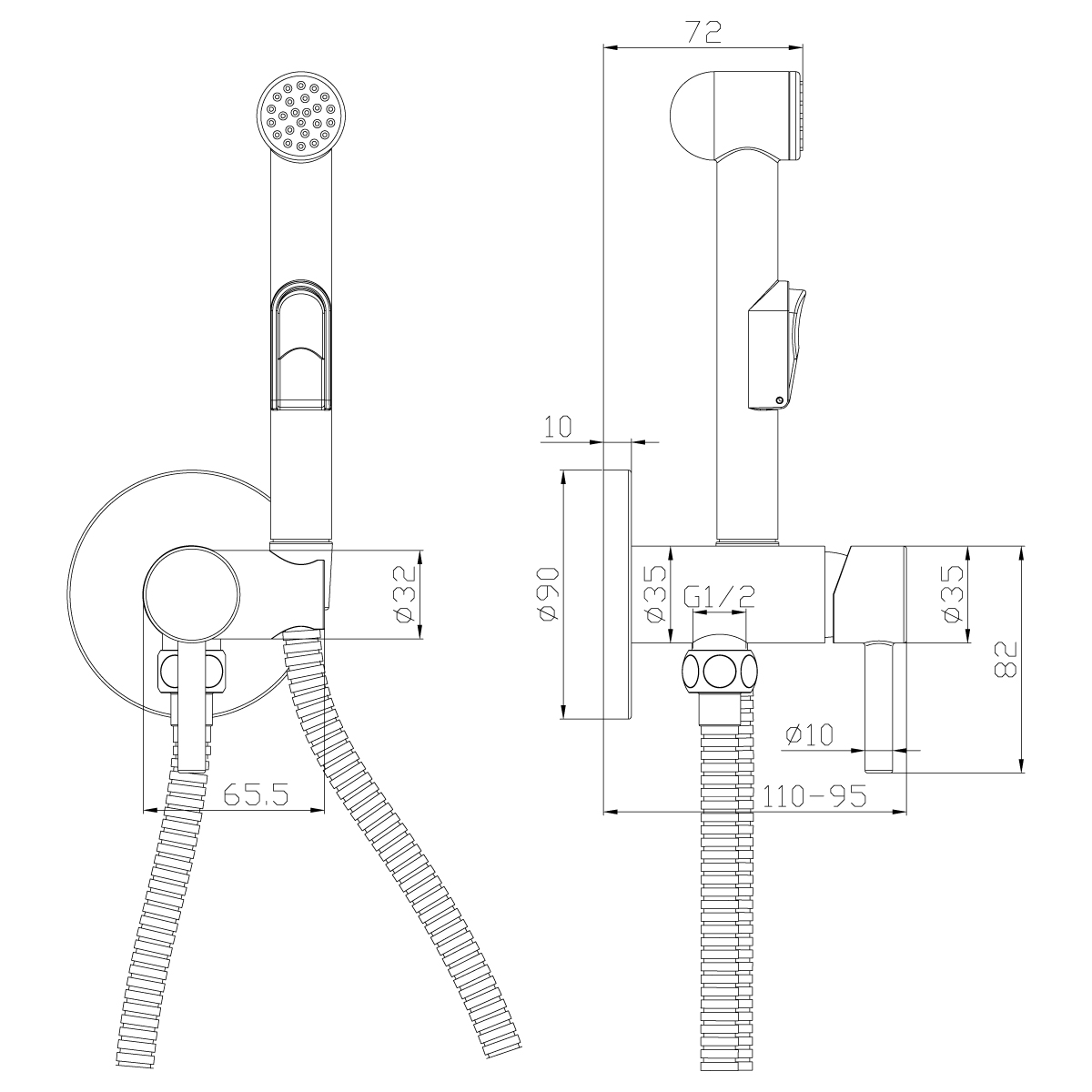 Корпус оборудован держателем для гигиенического душа прикрепленного к шлангу. Вода подается при нажатии на кнопку, которая находится на лейке. Латунный смеситель имеет хромированное покрытие, зеркальный блеск которого не тускнеет от средств бытовой химии.