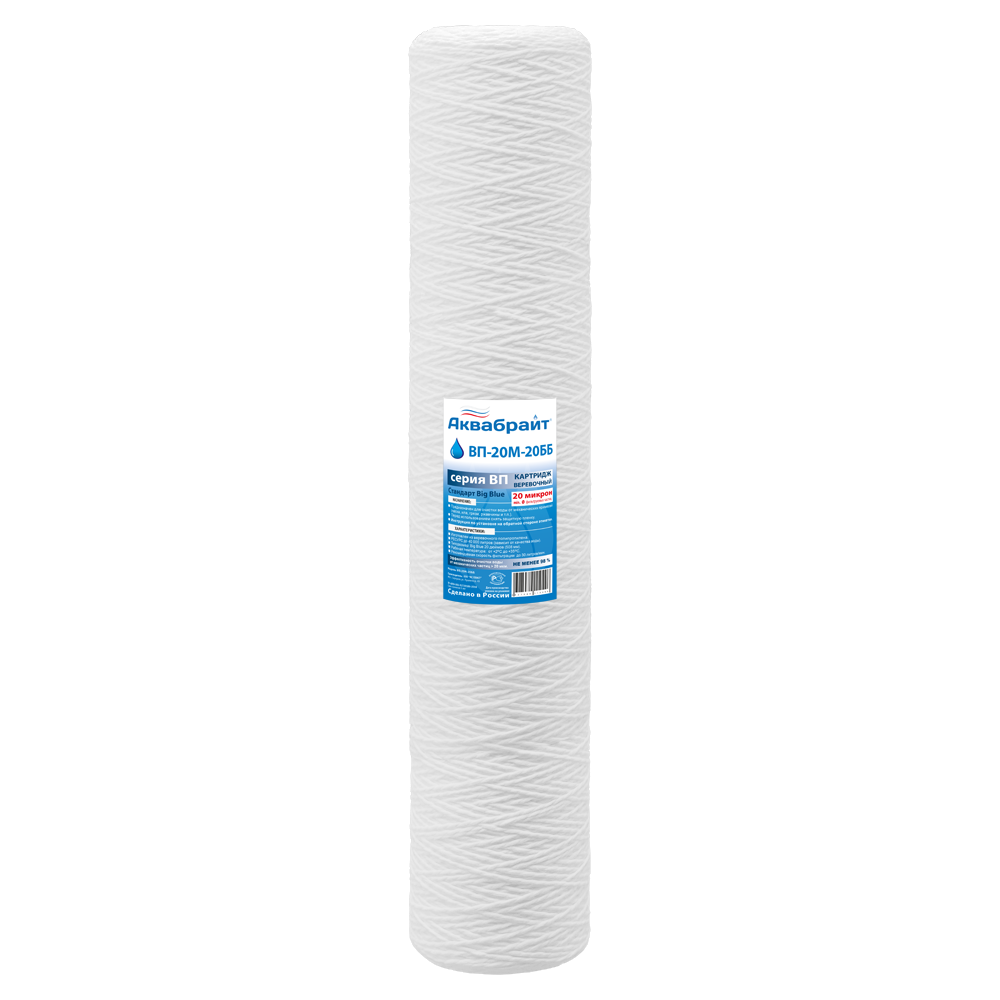 Картридж АКВАБРАЙТ ВП-20М-20ББ изготовлен из веревочного полипропилена с пищевым допуском.Веревочный полипропилен лучше удерживает крупные частицы, особенно при небольшом давлении. Принцип работы: вода проходит сквозь слои намотки, и механические загрязнения задерживаются между витками нити