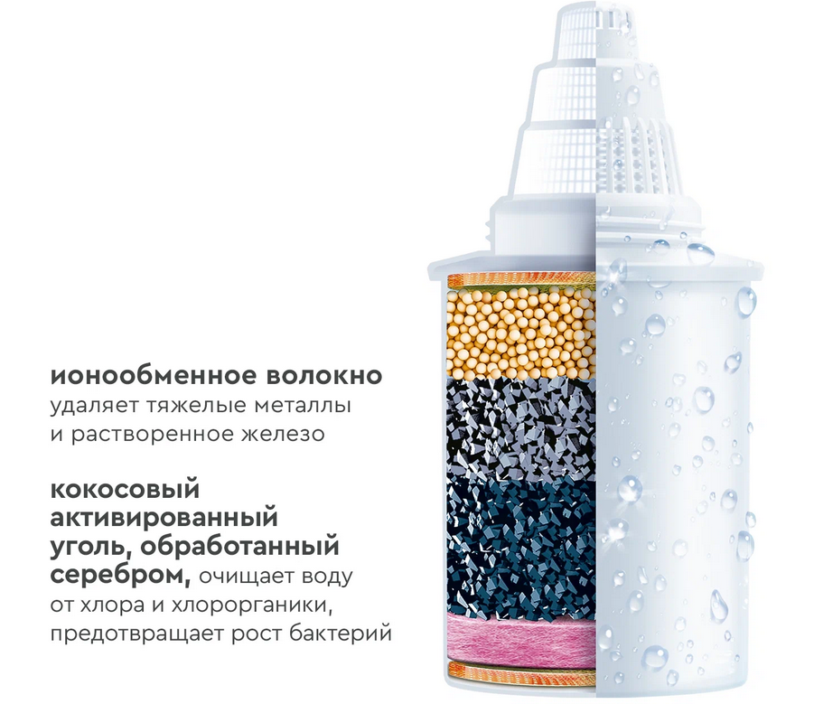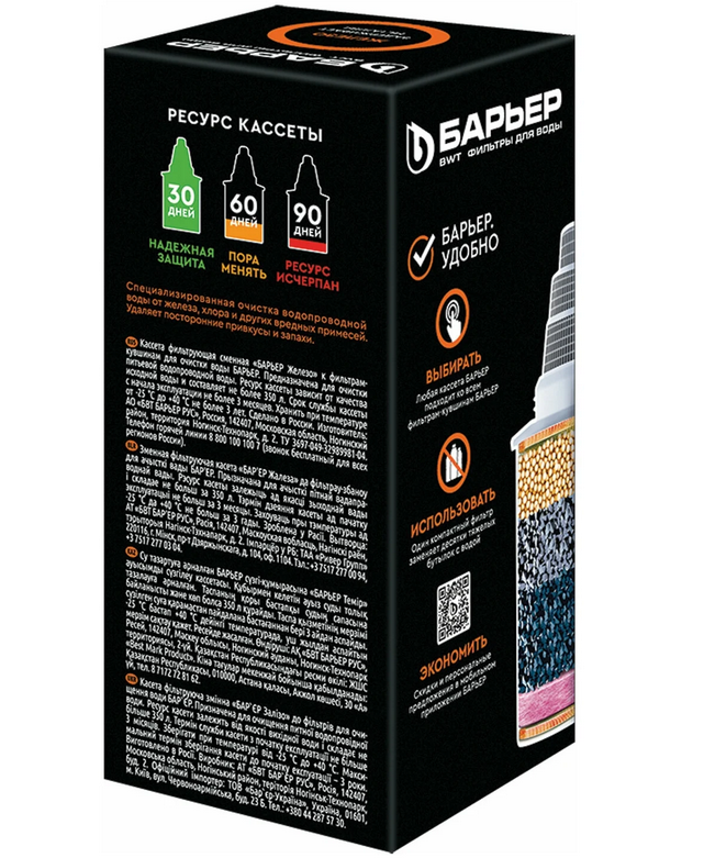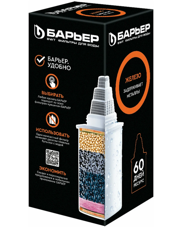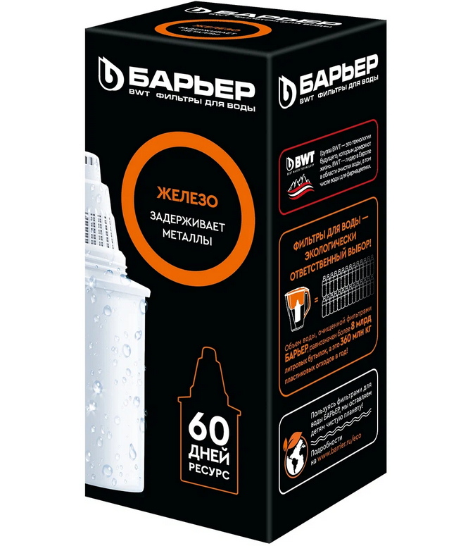 Специализированная очистка для городской воды с высоким содержанием железа. Устраняет как растворенное, так и не растворенное железо в пределах до 3 ПДК. Удаляет неприятный металлический привкус, делает воду прозрачной. Даёт базовую очистку от хлора, его подобных продуктов, тяжелых металлов. Ресурс зависит от качества исходной воды, но составляет не более 350 литров. В состав кассеты входит: смесь ионообменных смол - удаляет ионы тяжелых металлов и железа; кокосовый активированный уголь, обработанный серебром, - предотвращает рост бактерий; кокосовый активированный уголь - удаляет хлор и хлорорганику; ионообменное волокно - удаляет тяжелые металлы и растворенное железо. Все кассеты БАРЬЕР подходят ко всем кувшинам БАРЬЕР. Одна кассета БАРЬЕР способна заменить несколько сотен пластиковых бутылок. По окончанию ресурса кассеты можно сдать на переработку.