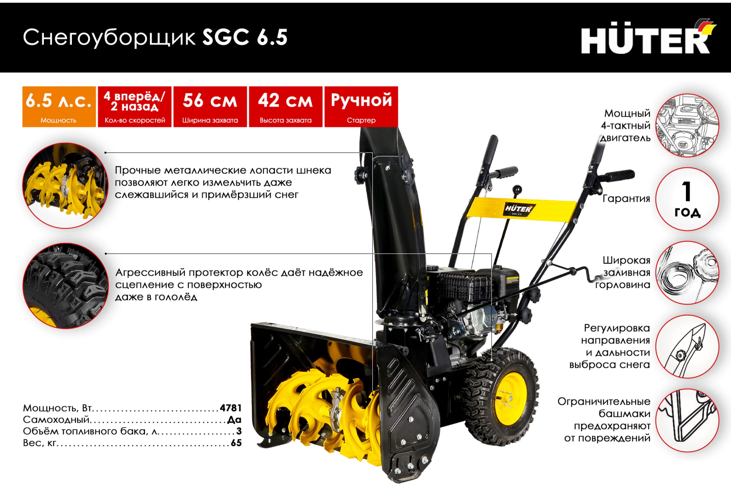 Снегоуборщик Huter SGC 6.5 70/7/25 применяется для уборки небольших территорий от снега.