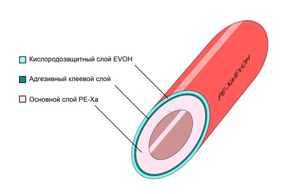 Внутренний основной «несущий» слой трубы, контактирующий с транспортируемой средой, выполнен из сшитого полиэтилена PE-Xa. Наружный барьерный (кислородозащитный) слой представляет собой тонкую оболочку из поливинилэтилена EVOH, практически полностью предотвращающую диффузию кислорода из окружающего воздуха в транспортируемую по трубопроводу среду. Для обеспечения надежного контакта наружного и барьерного слоев между ними нанесен клеевой (адгезивный) слой.