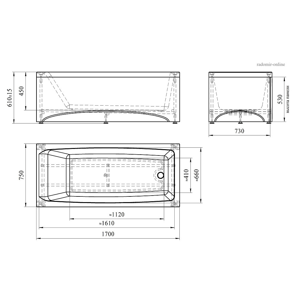 Ванна акриловая Radomir ВЕСТА 1700x750 на каркасе с экраном
