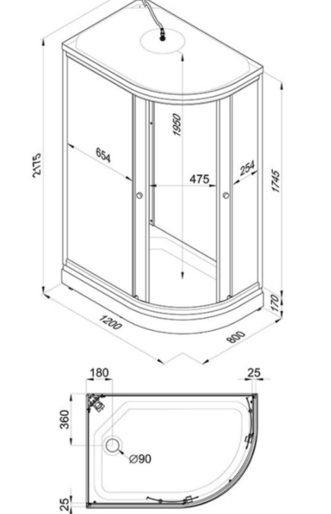 Душевая кабина с прямоугольным поддоном 120х80см с большим внутренним объемом, душем на шланге и тропическим душем.