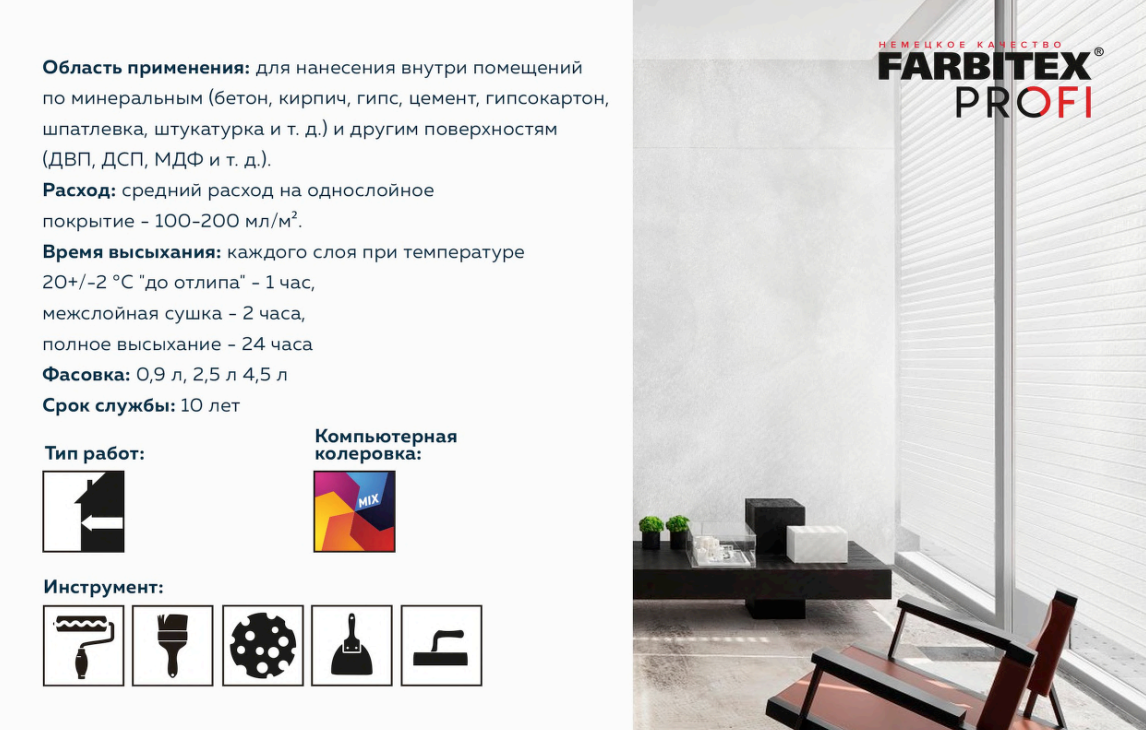 Предназначено для нанесения внутри помещений по минеральным (бетон, кирпич, гипс, цемент, гипсокартон, шпатлевка, штукатурка и т. д.) и другим (ДВП, ДСП, МДФ и т. д.) поверхностям. Преимущества: